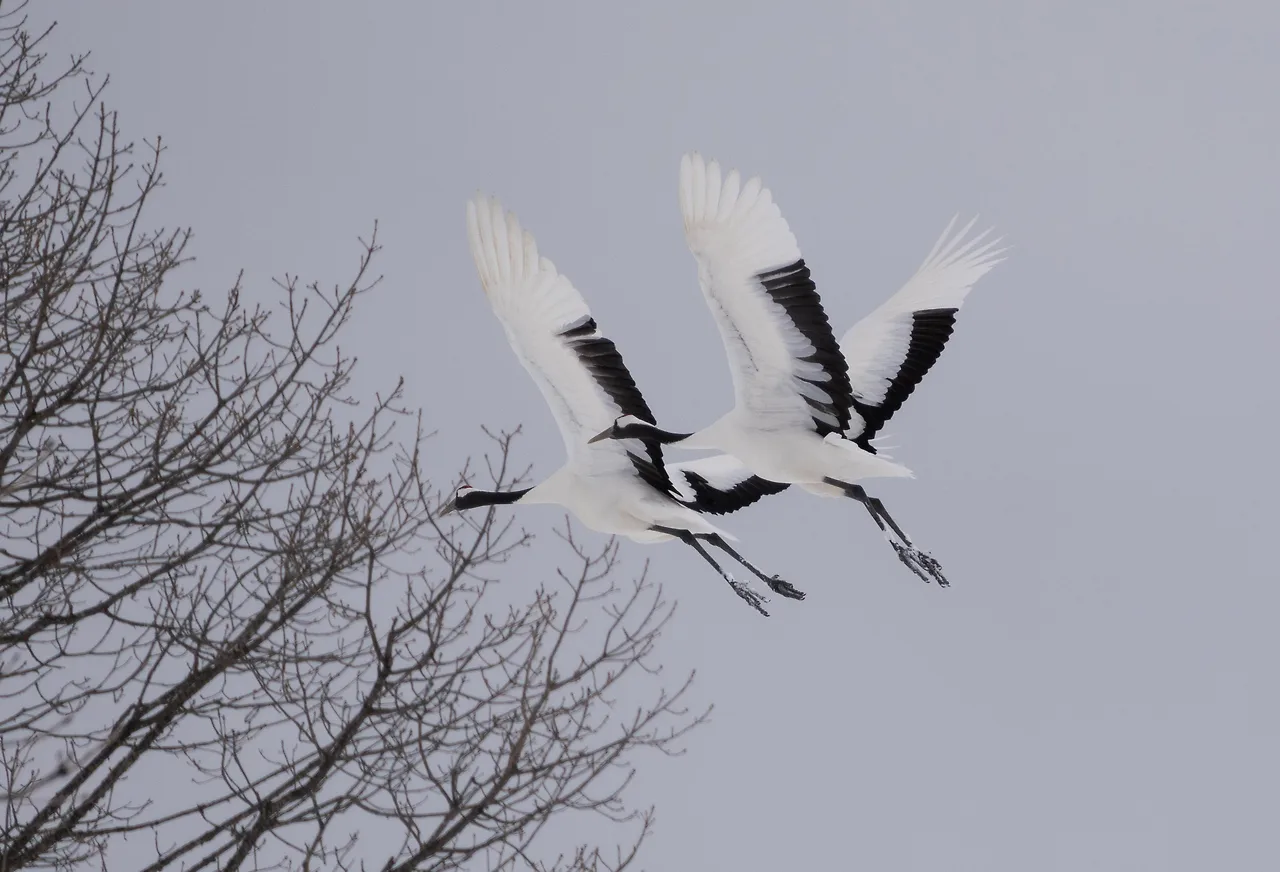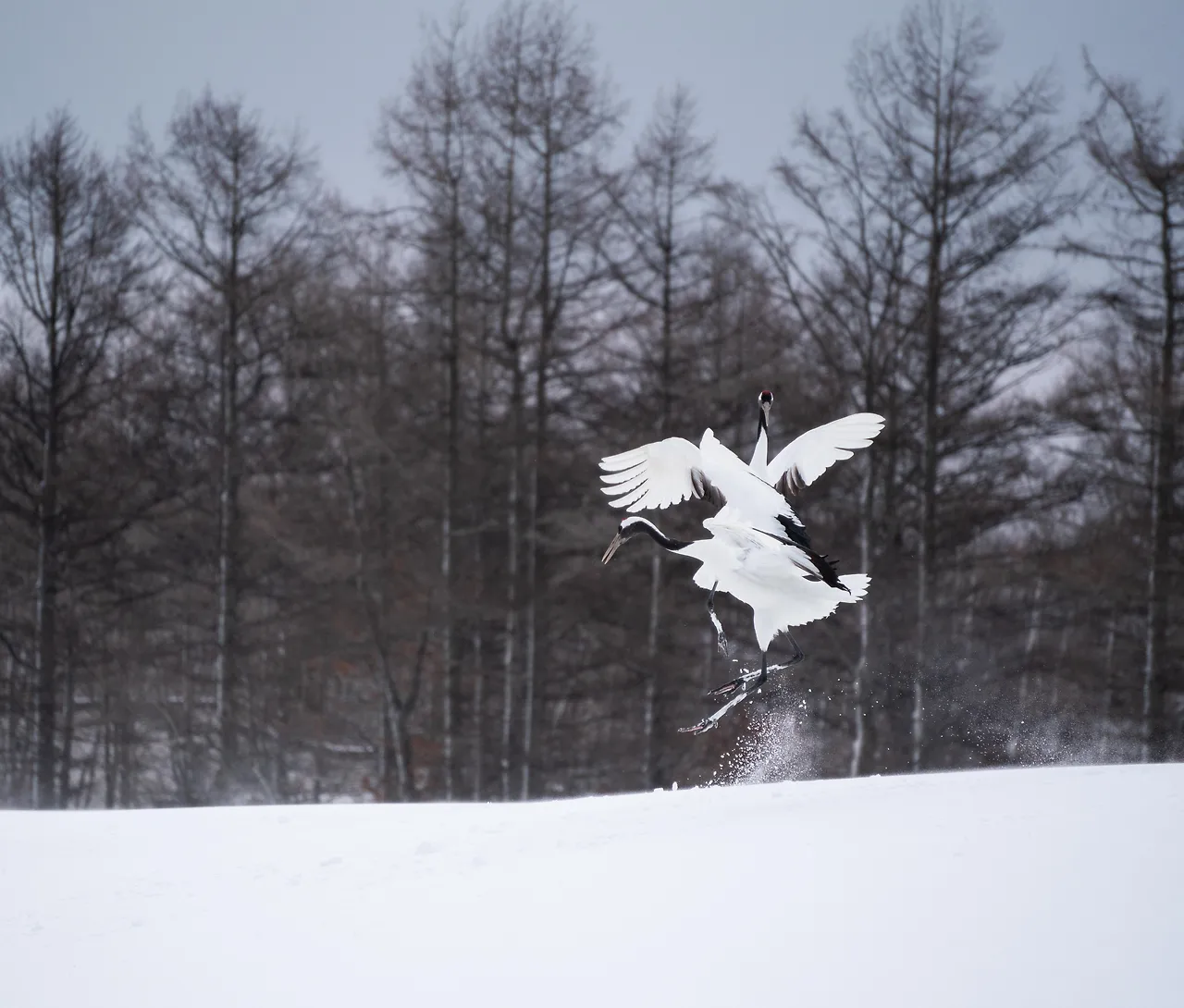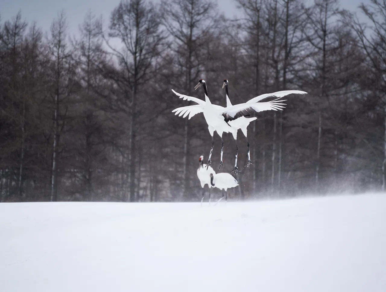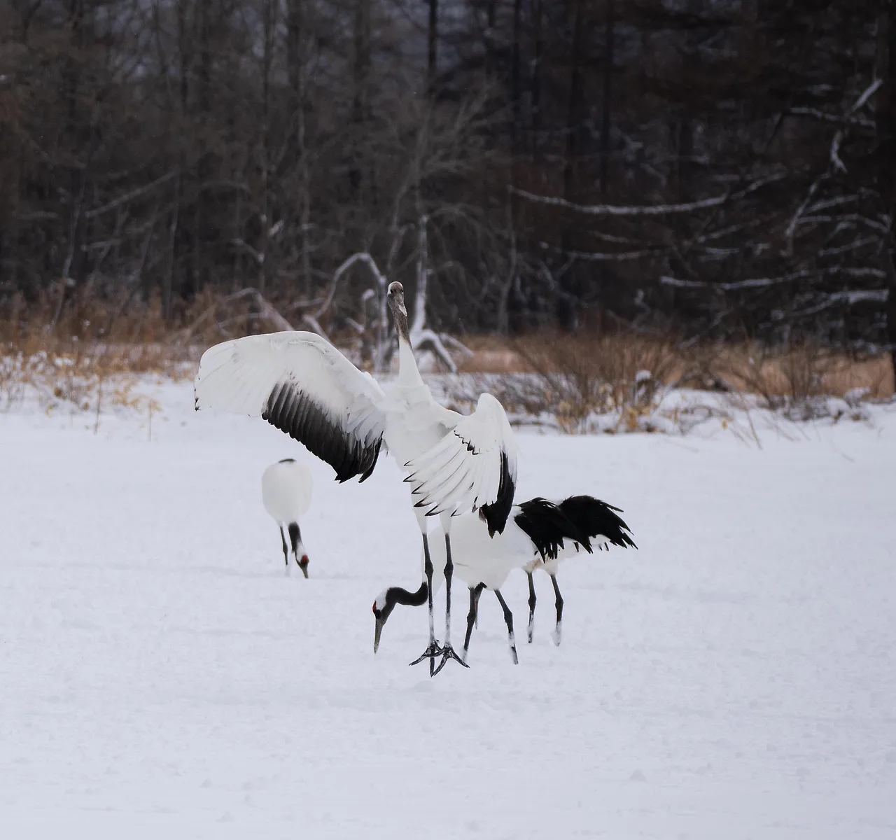 학(鶴)은 두루미과의 한 종으로, 한국 철원에서도 관찰할 수 있는 겨울 철새이다. 홋카이도 동부는 흰 깃털에 머리에 빨간 왕관을 쓴 단정학 (丹頂鶴, Red-crowned crane)이 많은데 일본에서는 탄조(Tancho)라 부른다. 겨울을 이곳에서 보내기 위해 시베리아에서 날아온다. 키가 1미터 40센티미터고 날개를 펼치면 2미터 40센티미터가 되는 거구다. 목과 다리가 길며 우아하고 기품이 있다. 30년에서 50년을 사는 장수동물로 일부일처제라 한다. 감정표현을 잘하며 서로 짝을 이루면 끝없이 애정 표현을 한다. 번식기의 수컷은 화려한 춤으로 구애를 한다. 수컷은 콩, 암컷은 꼬깍하며 반응하는데 새의 언어로 '사랑해요' 란 뜻이란다. 학들은 식사가 끝나면 구애춤(Courtship dance)을 춘다. 이 춤은 적수로부터 애인을 방어하고 짝과의 관계를 돈독하게 한다. 서로의 애정을 재확인하는 몸짓이라 한다.