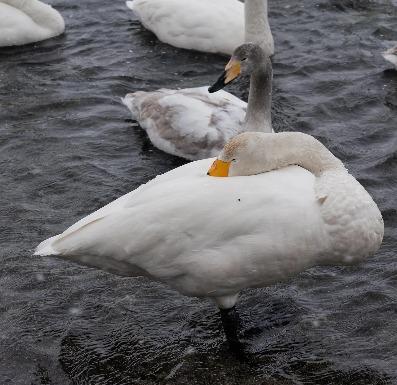 호수의 가장자리만 얼지 않은 물이 겨우 남아 있었다. 그 좁은 공간에 수십 마리의 백조들이 떠 있었다. 난생처음 백조를 가까이서 보는 터라 신기했다. 하얀 깃털에 긴 목을 하고 노란 부리를 가진 백조는 목이 긴 오리 같아 보여 상상하던 백조와는 달랐다. 얼음 위엔 공처럼 몸을 말은 백조들이 머리를 깃 속에 파묻고 있다. 이 강추위에 바람 피할 곳 없는 호수 위에서 온몸으로 고스란히 눈보라를 맞고 있었다.