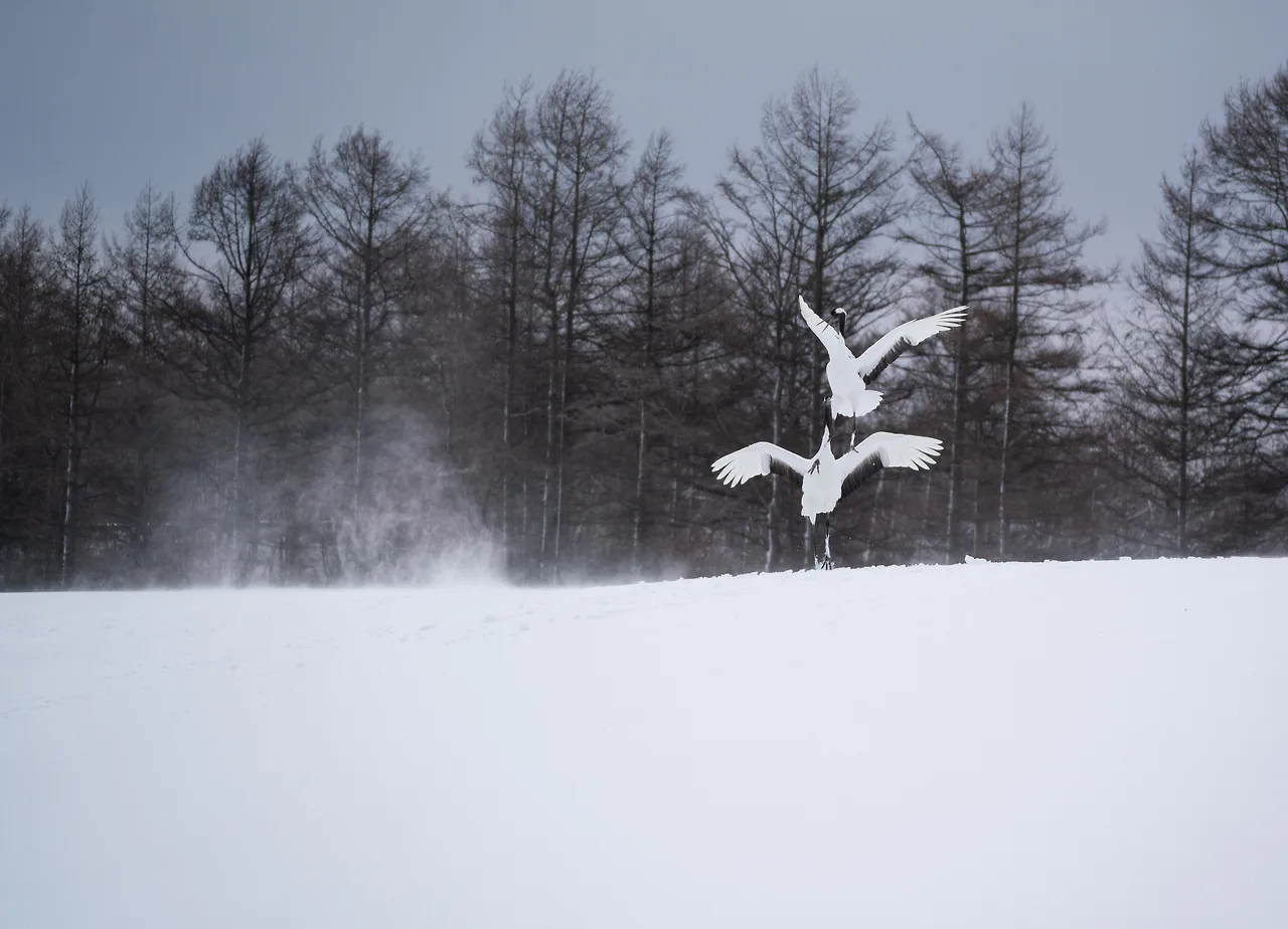 학에게 먹이를 제공한다는 츠루이 학 보호구역으로 자리를 옮겼다. 눈으로 덮인 넓은 들판에 40여 마리의 학들이 먹이를 기다리고 있었다. 바람은 들판의 눈을 쓸어 추위로 웅크리고 있는 학들에게 사정없이 뿌려댔다. 머리를 날개 속에 묻고 한 다리로 선 그들은 꼼짝하지 않았다. 사진을 찍으러 온 사람들도 발을 동동 구르며 추위를 이겨내고 있었다. 갑자기 학들이 일제히 고개를 들어 울어 제치기 시작했다. 그러자 멀리서 학들이 날아오기 시작했다. 멀리 있는 친구와 가족을 식사시간이라고 부르는 소리였다. 친구들이 오자 날개를 펼치며 뚜뚜루룩 소리를 내며 환영인사를 했다.