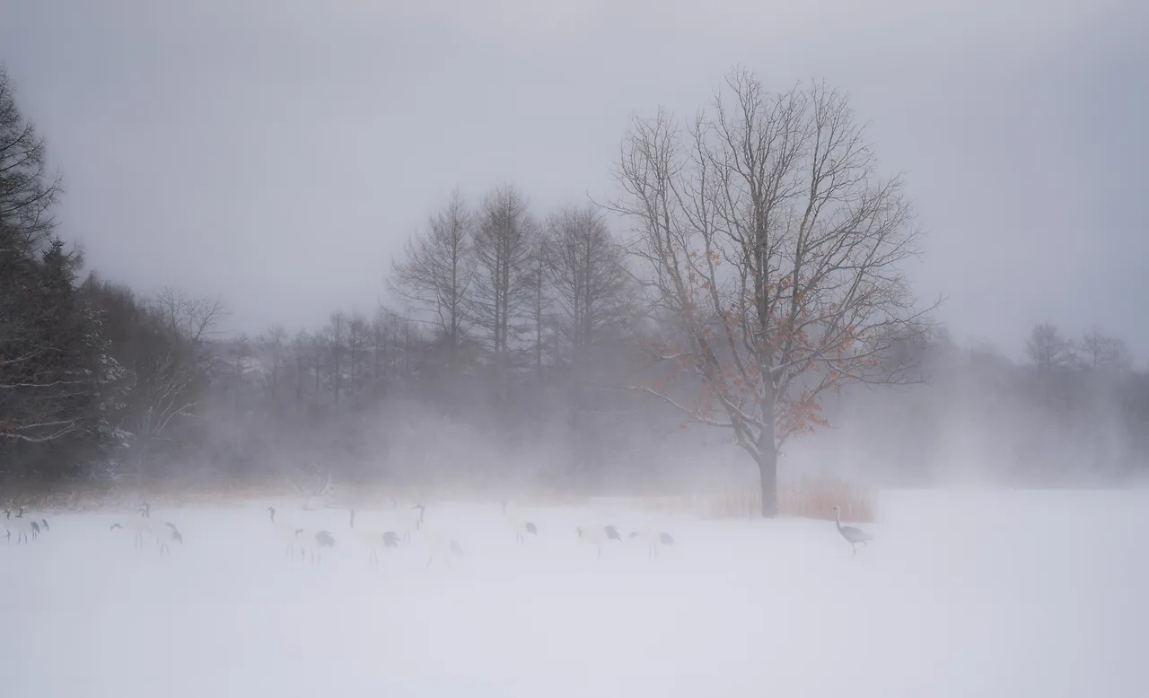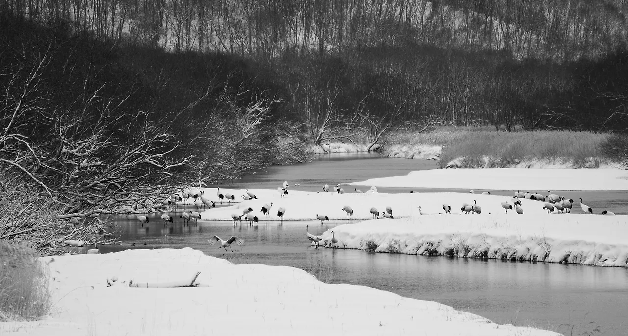 희미한 여명사이로 스츠리강이 멀리 산을 배경으로 드러났다. 얕은 강 위로 눈 덮인 모래톱들이 강물의 흐름을 인도한다. 강으로 뿌리를 내린 나무와 풀들이 강을 껴안으며 찬바람을 막아주고 있다. 그래서일까 이 추위에 강물은 얼지 않고 흐른다. 흩날리는 눈으로 인해 산은 아스라이 멀어 보인다. 망원렌즈로 당겨서야 스츠리강 저편 모래톱 가에 모여있는 학들을 볼 수 있었다. 혹한의 밤을 지새운 학들은 아직 잠에서 깨어나지 않았는지 물 위에 한 다리로 서서 움직임이 없다.