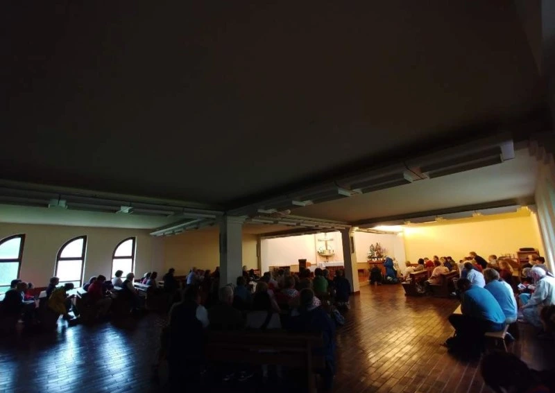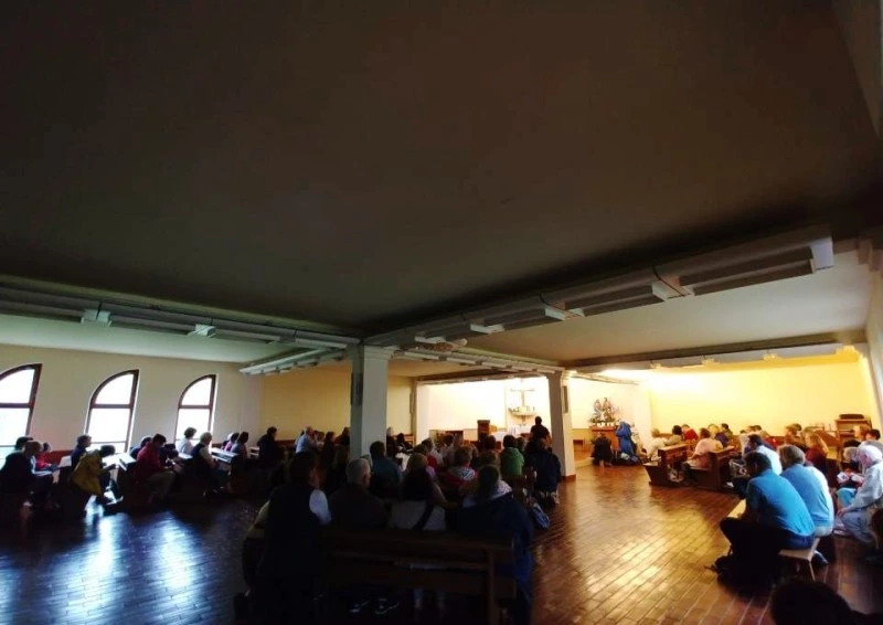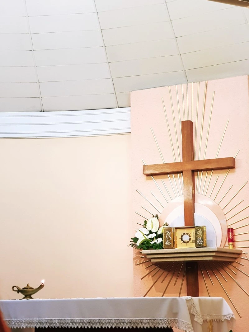 문을 열고 들어가니 이미 사람들로 가득했다. 제대에는 램프 모양의 초 하나가 조용히 타고 있었고, 감실 앞에는 작은 성체가 모셔져 있었다. 사람들이 모두 성체를 향해 앉아 있는 모습만으로도 감동이었다.