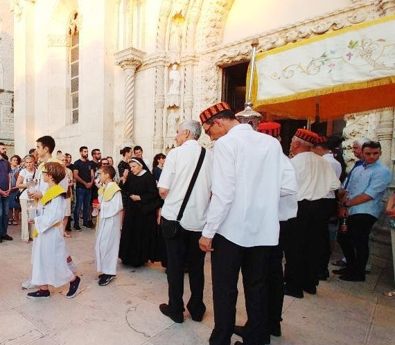 미사가 끝날 무렵 가운데 통로가 정리되는 걸 보니 아마도 주교님과 신부님들께서 다시 입구 방향으로 퇴장하실 것 같아 성당 밖으로 나왔다. 그런데! 이곳 전통의상으로 보이는 모자를 쓴 나이 든 남자분들이 서 있었다. 그리고 사람들은 더 많이 모여 있었다. 성당 앞에는 작은 제대도 준비되어 있었다. 영문을 몰라 우선은 제일 가까운 자리에 서 있어 봤다. 그랬더니 주교님께서 성체를 모시고 나오셨다.
