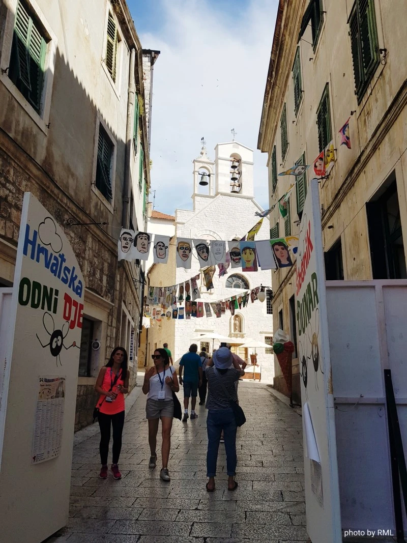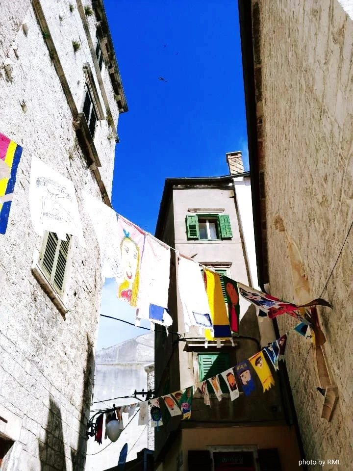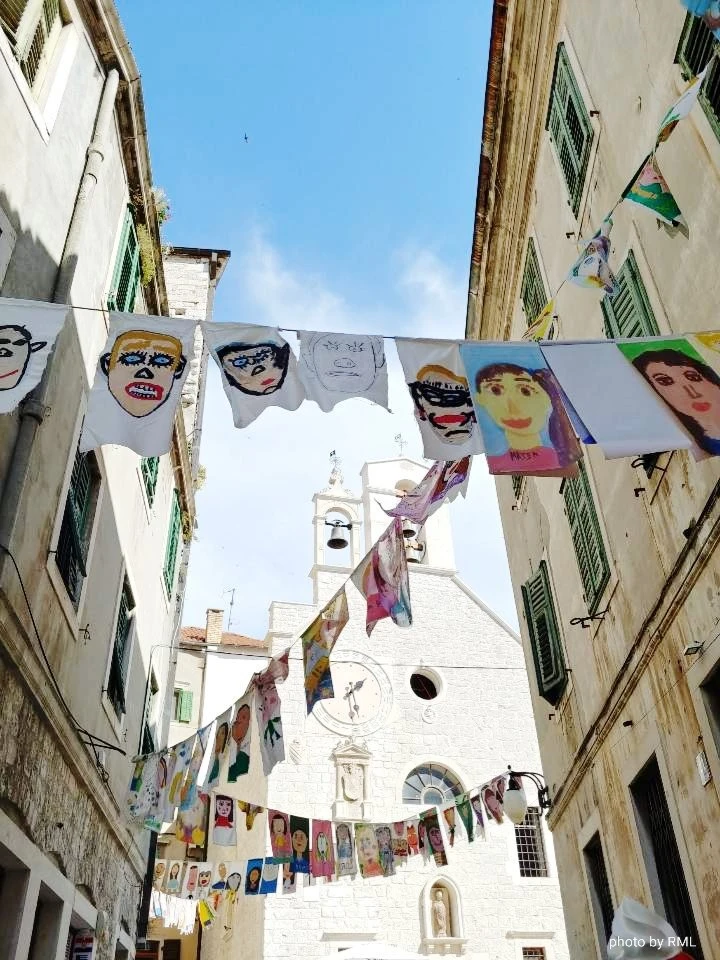 언덕진 골목길을 걸었다. 그런데 하늘에 어린이들이 그린 듯 한 재미난 그림들이 가득 걸려 있었다. 알록달록 생기 넘치는 컬러에 다양한 이목구비, 삐뚤빼뚤하게 쓴 이름까지 그림마다 앙증맞았다. 골목골목 가는 길마다 바람에 흔들거리는 그림들이 마치 시베니크에 처음 온 우리에게 반갑게 손인사를 해주는 것 같아 기분이 좋았다. (나중에 알고 보니 세계 어린이 그림축제 기간이었다)