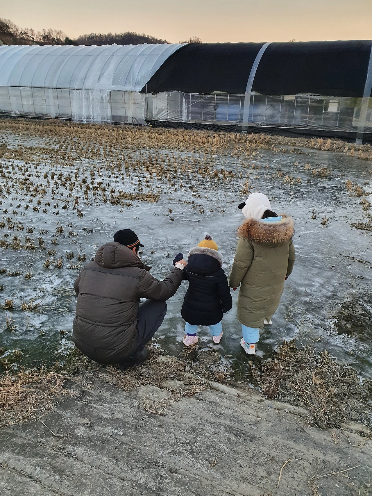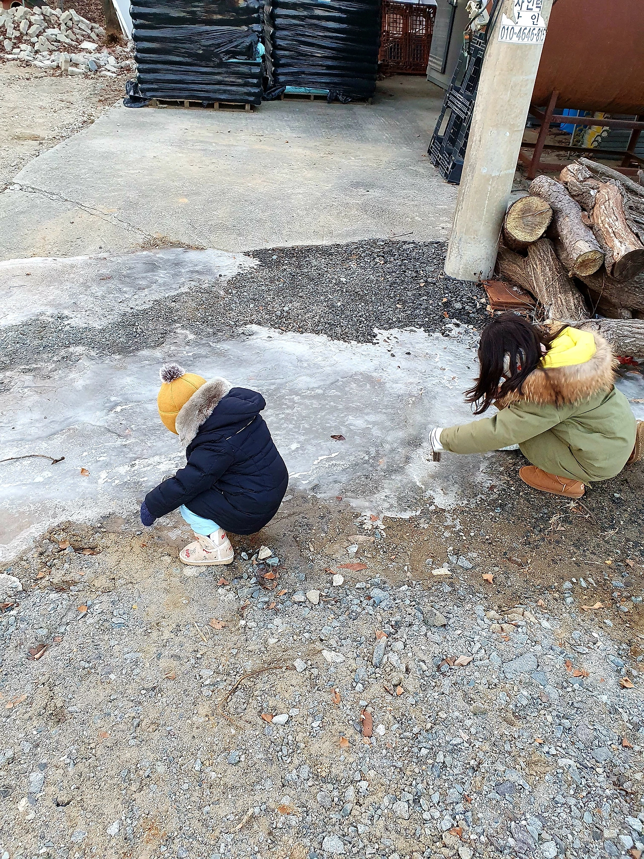 얼음이 있는 곳은 어디나 금방 아이들의 놀이터가 됩니다. 장갑 낀 손으로 만지고, 깨 보기도 하고, 스케이트 타듯 놀기도 하죠.