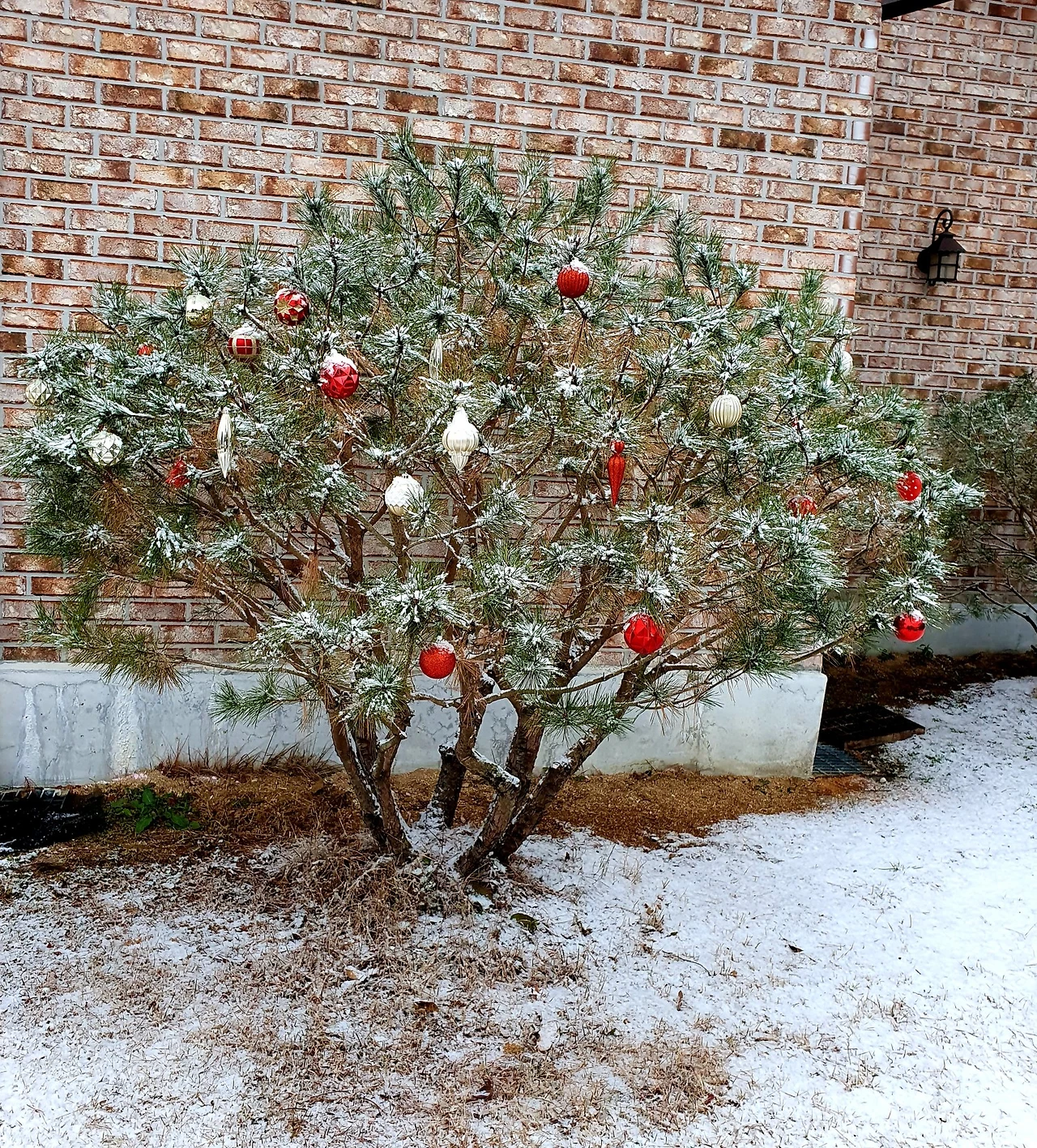마당에 진짜 나무로 크리스마스트리를 꾸며 보았습니다.