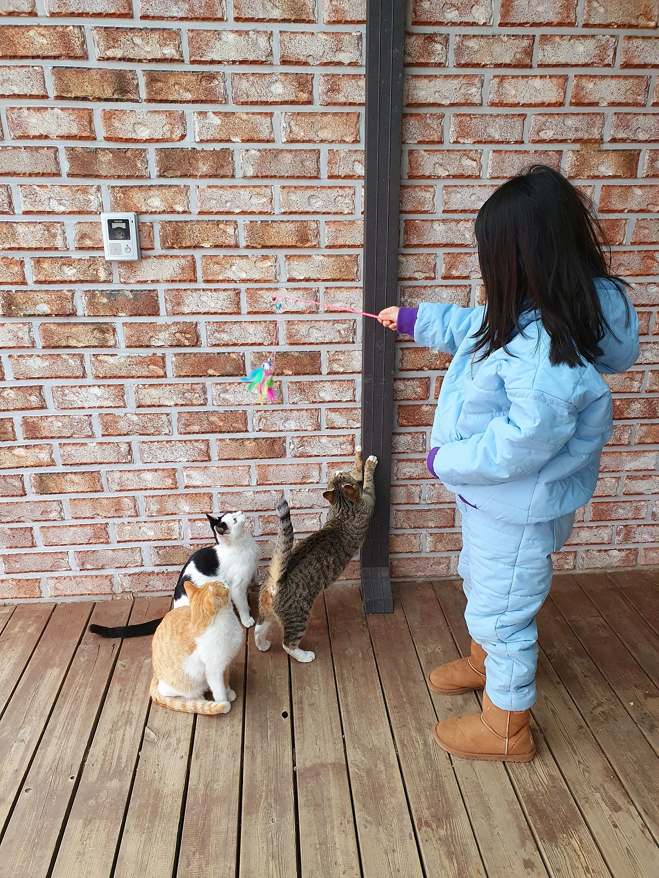 햇살 좋은 낮엔 열심히 마당냥이와 놀아줍니다. 고양이들 덕분에 아이들은 겨울에도 거의 마당에서 시간을 보냈어요. 언제나 고마운 냥이들입니다.