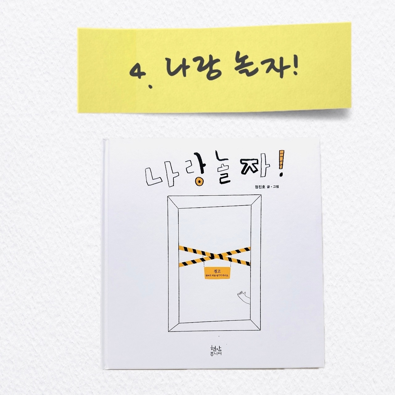 4. 나랑 놀자!_ 정진호 작가의 책을 두 권이나 구입했네요. 이 책도 굉장히 재미있어요. 제가 아이랑 게임하듯 놀아주는 참여형 그림책을 아이들에게 강추하는데, 이 책도 딱 그렇습니다. 그림책이 끊임없이 독자에게 말을 걸며 참여하게 하는데, 아이들은 이런 그림책을 주도적으로 읽게 되면서 책의 세계에 빠져들게 되겠죠?