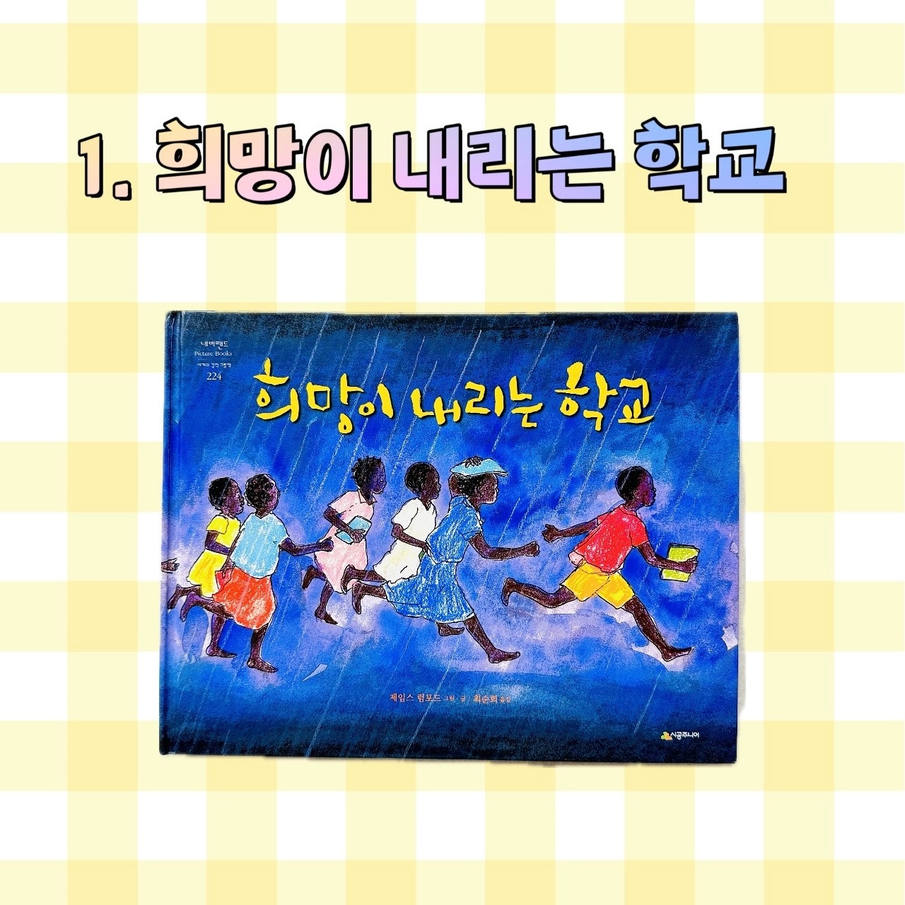 1. 희망이 내리는 학교_ 아프리카 차드라는 나라를 알고 계신가요? 우리는 학교 가기 싫을 때도 많지만, 이 나라의 아이들은 개학 날을 손꼽아 기다립니다. 그런데 막상 도착해 보면 교실도, 책상도 없어요. 선생님의 말씀에 따르면 첫 수업은 손수 교실을 짓는 것부터 시작된다죠! 그림책을 통해 우리와 다른 교육 환경을 들여다보며, 배움의 진정한 가치와 의미를 생각해 볼 수 있는 그림책이랍니다.