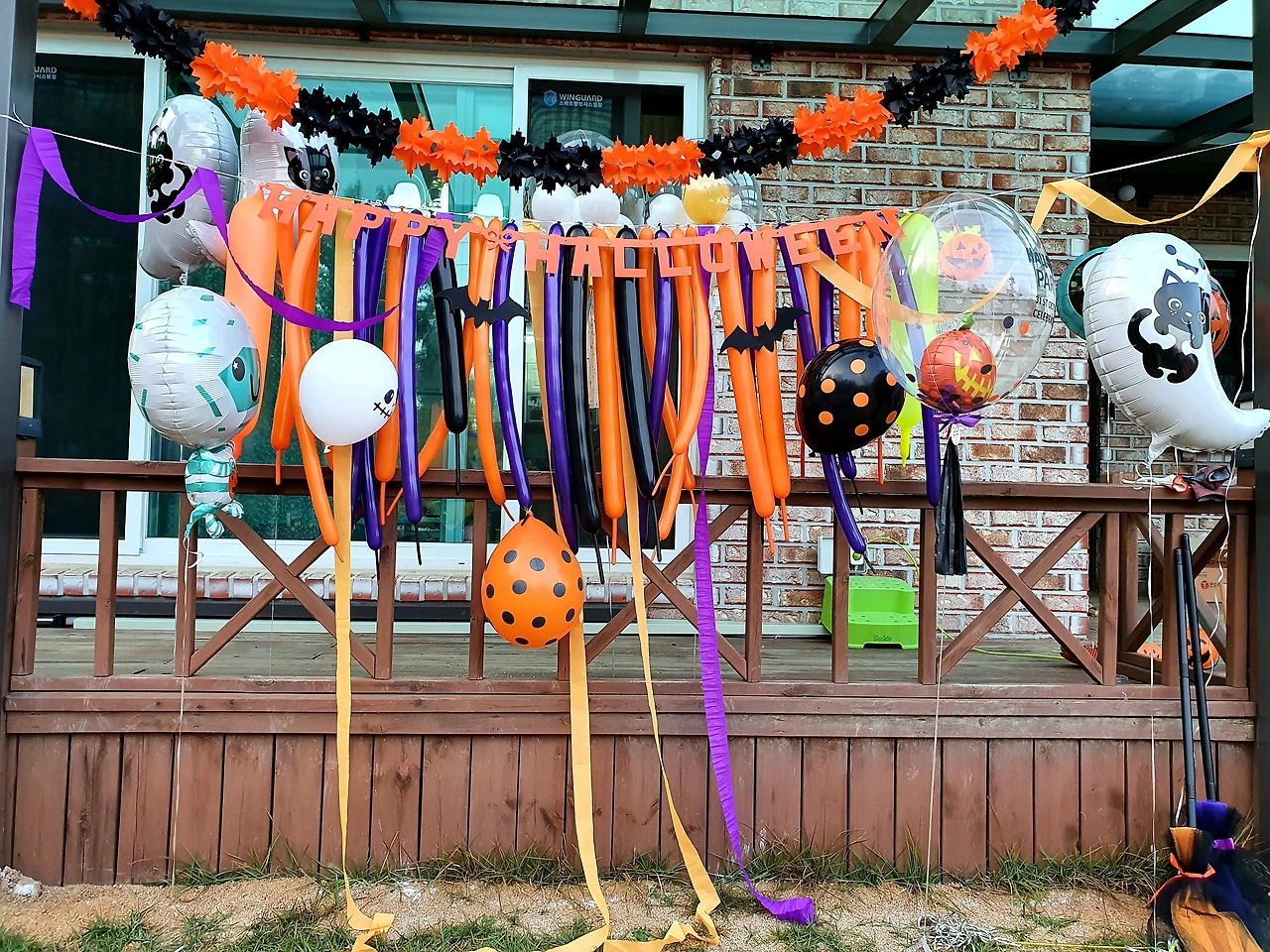 아이들도 코스튬을 입고, 마당의 테이블과 식기도 할로윈 느낌으로 준비했었어요. 그 때도 할로윈 느낌의 풍선 세트가 빛을 발했었죠.