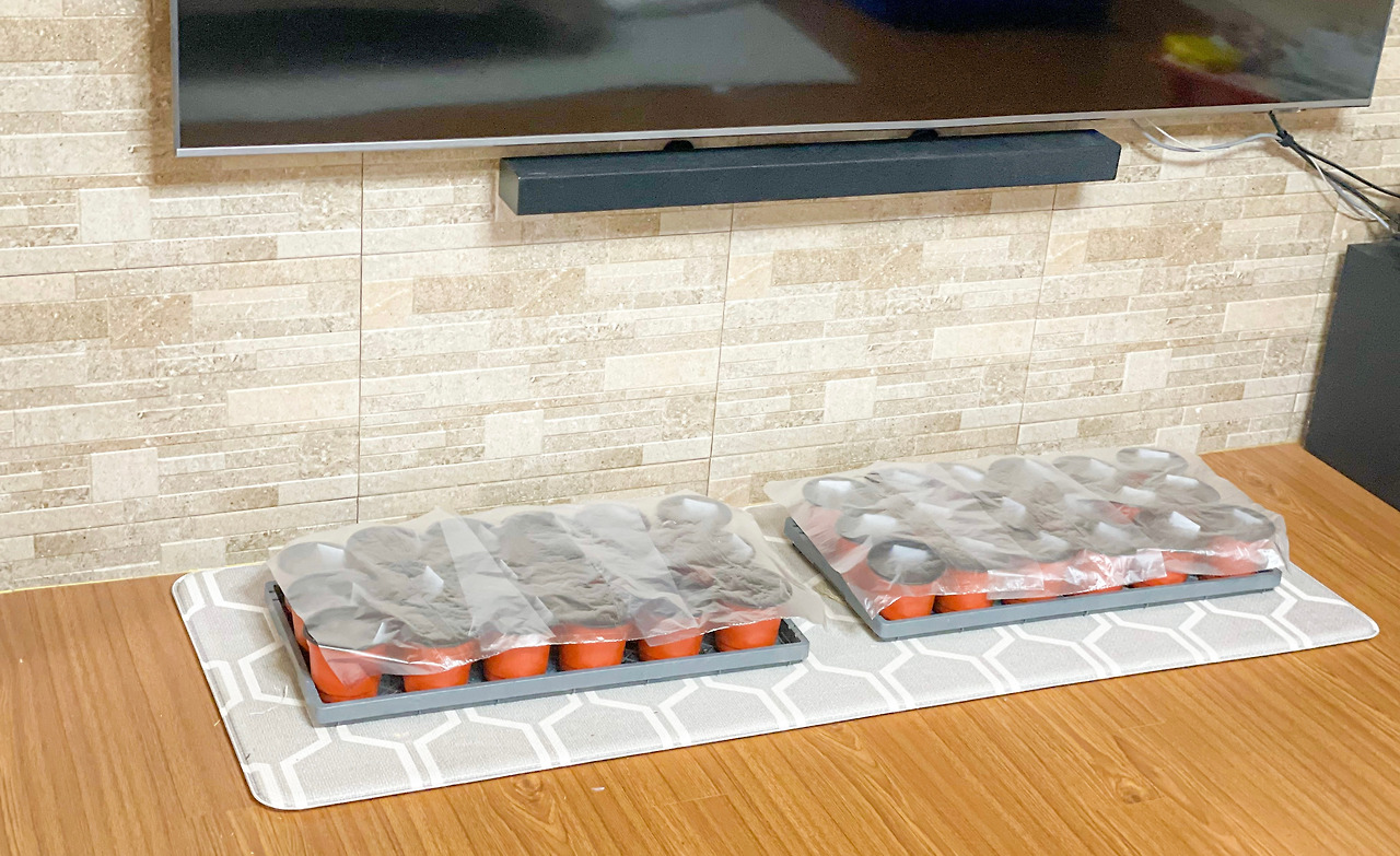트레이에 물을 부어 저면관수를 시켜주고, 위에는 비닐을 덮어주어 수분의 증발을 막아주었어요.
