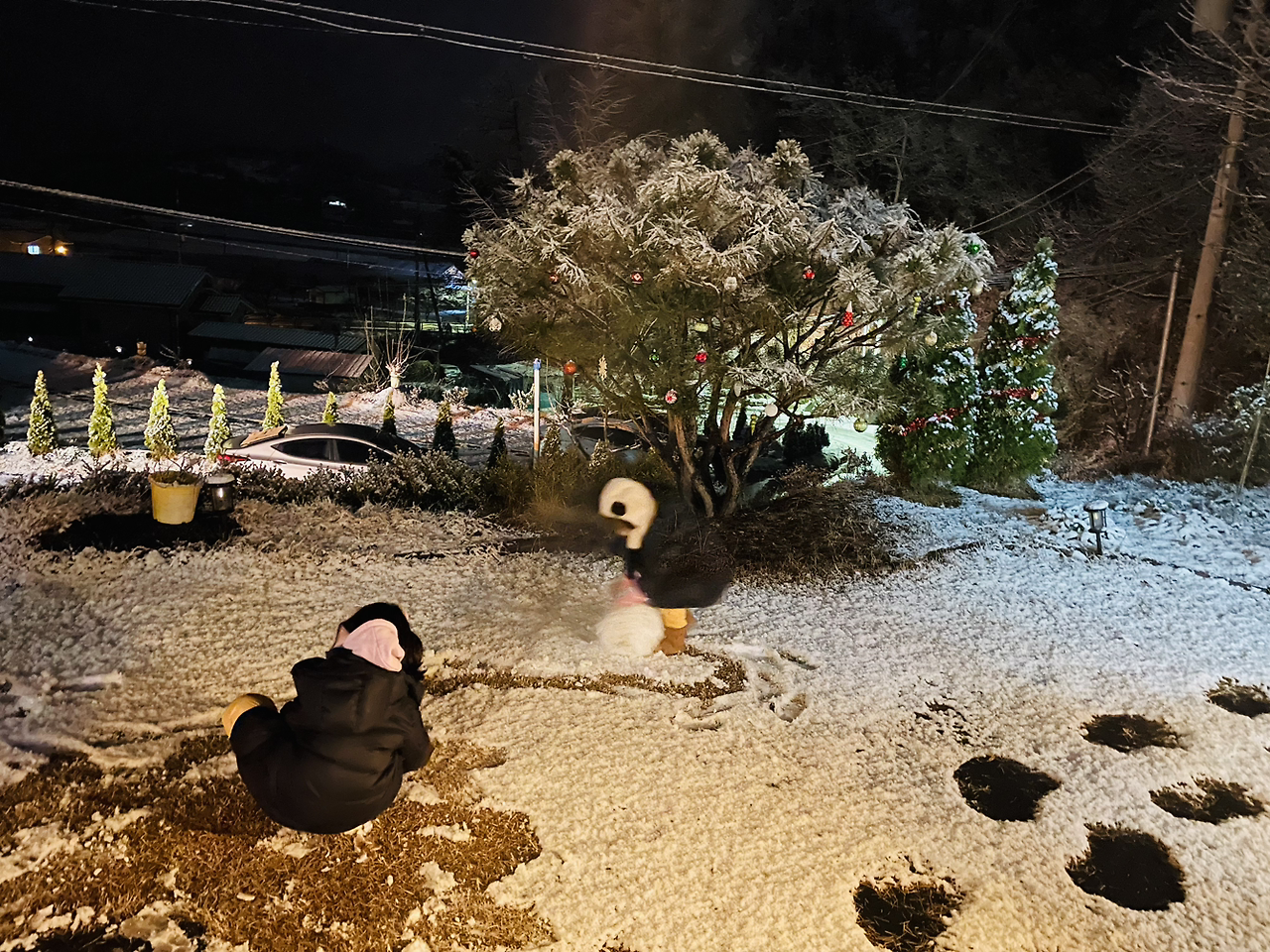이렇게 눈이 쌓이면 낮이든 밤이든 우리 가족은 밖으로 총출동을 합니다. 아이들은 눈놀이가 하고 싶고, 어른들은 마을 도로 초입에 눈이 잘 녹지 않는 곳을 쓸러 가야하거든요.