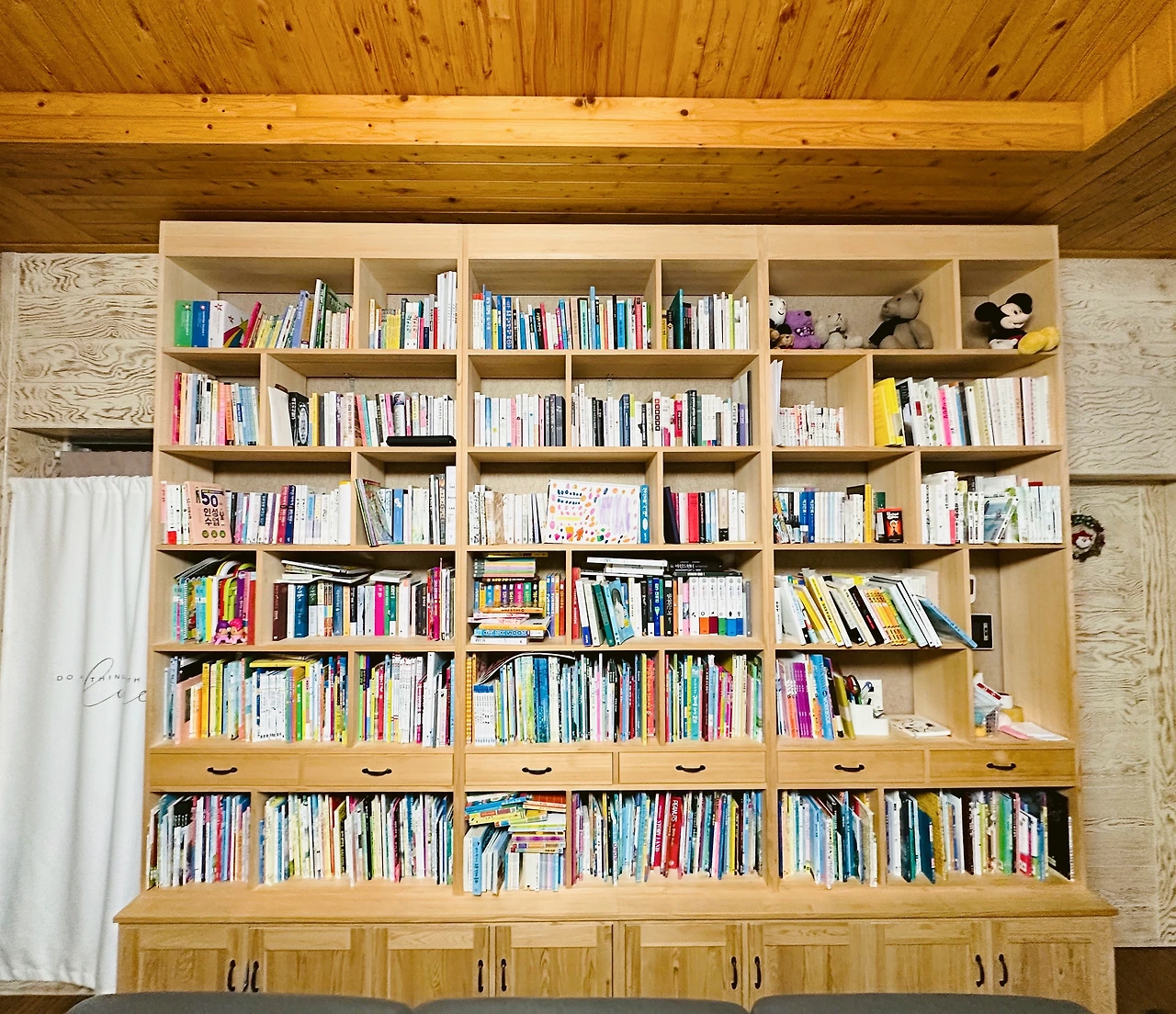 저희가 사는 전원주택에 방 크기가 애매해서 서재방을 따로 만들지 못했어요. 그래서 대신 거실 전면 책장을 마련했죠. 근데 이렇게 해 놓으니 주 활동 공간에 책들이 눈에 잘 띄어서 그런지, 아이들이 심심할 때 책을 찾아서 읽더라고요. 저희는 거실 천장이 높아서 책장이 이렇게 크지만, 이렇게 커다란 책장이 아니더라도 아이가 하루 중 많은 시간을 보내는 거실에 책장을 놓아보세요. 거창하게 TV를 없애지 않아도 TV를 꺼둔 시간에 자연히 책에 손이 가는 아이의 모습을 보실 수 있을 겁니다.