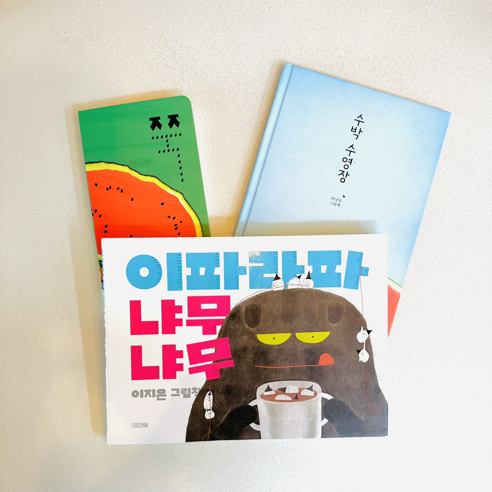 3. 수박 수영장_쭉을 보더니 수박 수영장도 읽고 싶다고 들고 온 둘찌! 관련된 소재를 찾아오는 것이 참 신기했어요. 그러고보니 수박 수영장도 우리집 스테디셀러입니다. 얼마전 뮤지컬까지 봐서 그런지 더 좋아하게 되었어요.