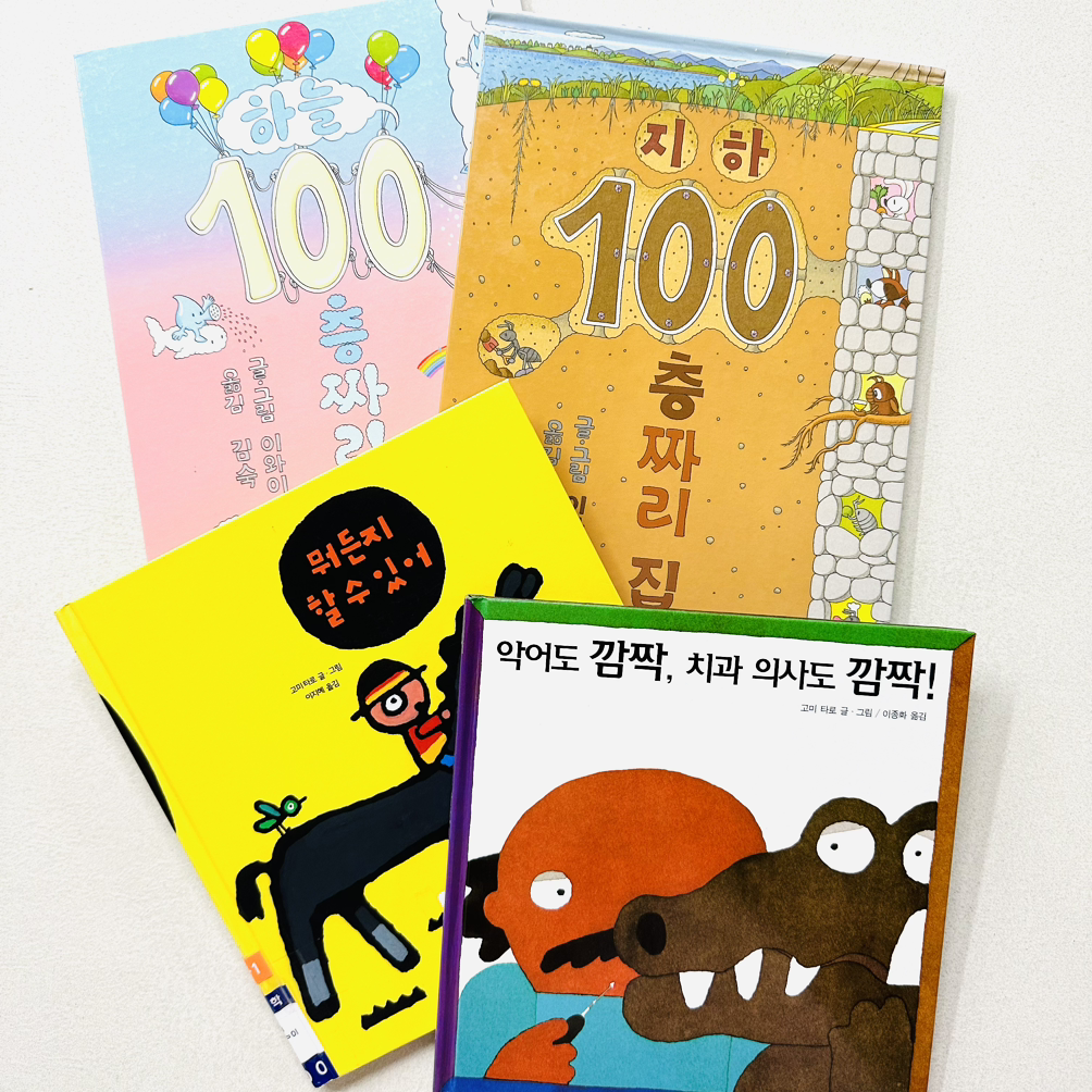 1. 하늘100층짜리 집, 지하 100층짜리 집_다른 집들도 비슷하겠지만, 우리집에서도 진짜 스테디셀러죠! 엄마가 목이 아픈 날이나 빨리 재워야 하는 타이밍에 이렇게 글밥 많은 그림책을 들고 오면 솔직히 안 반가울 때도 있지만, 그래도 최대한 재미있게 읽어주려고 노력합니다. 제본이 정확히 반대인 두책. 위로 올라가는 느낌과 아래로 내려가는 느낌을 줍니다.