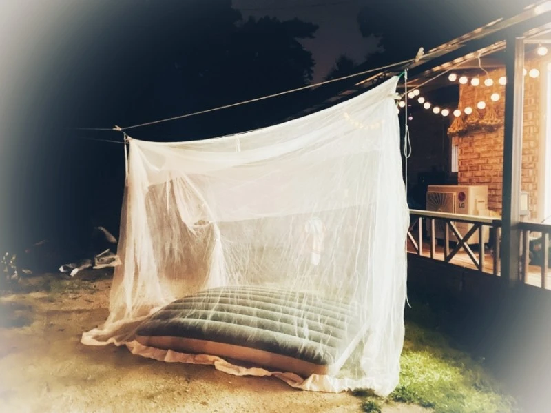 남편한테 에어베드랑 모기장을 설치해달라고 했어요.