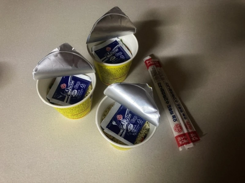 얼른 부엌에 들어가 휴대폰 불빛을 비춰가며 컵라면 세 개에 물을 부었어요.