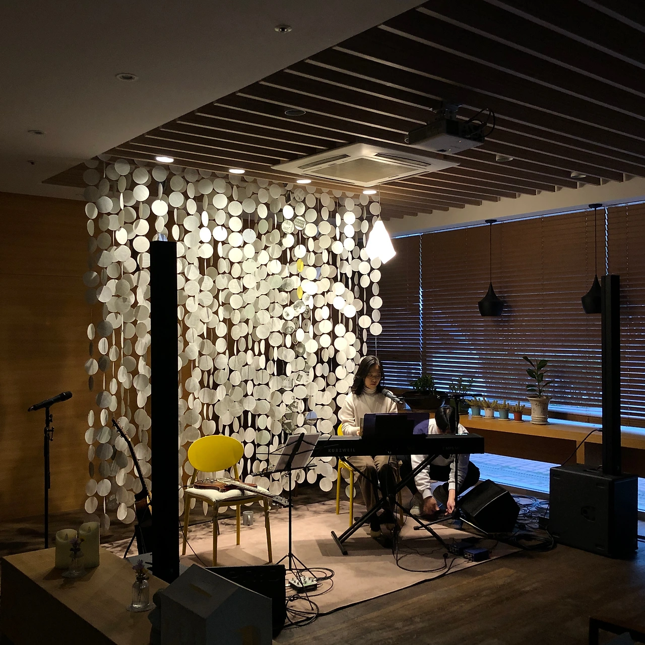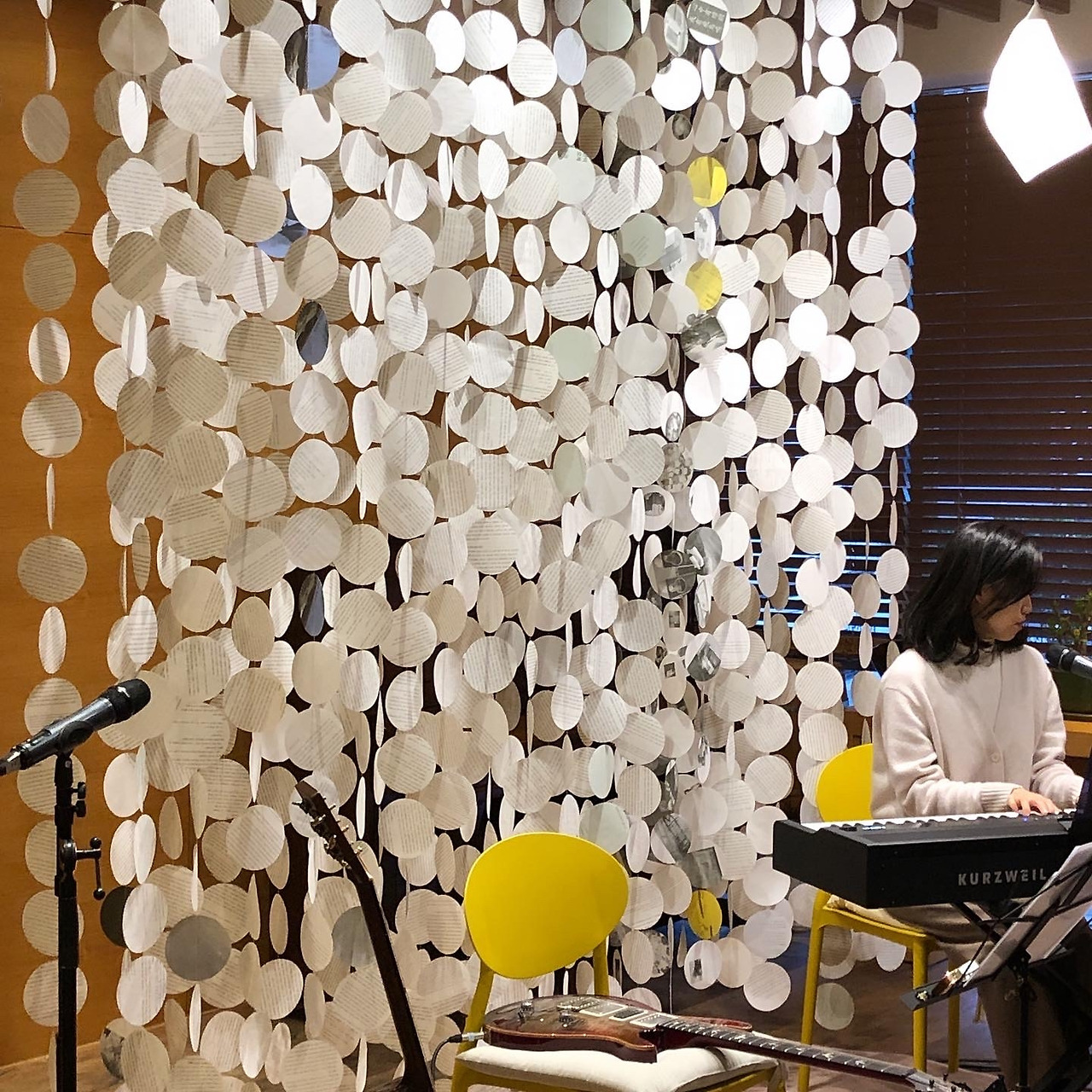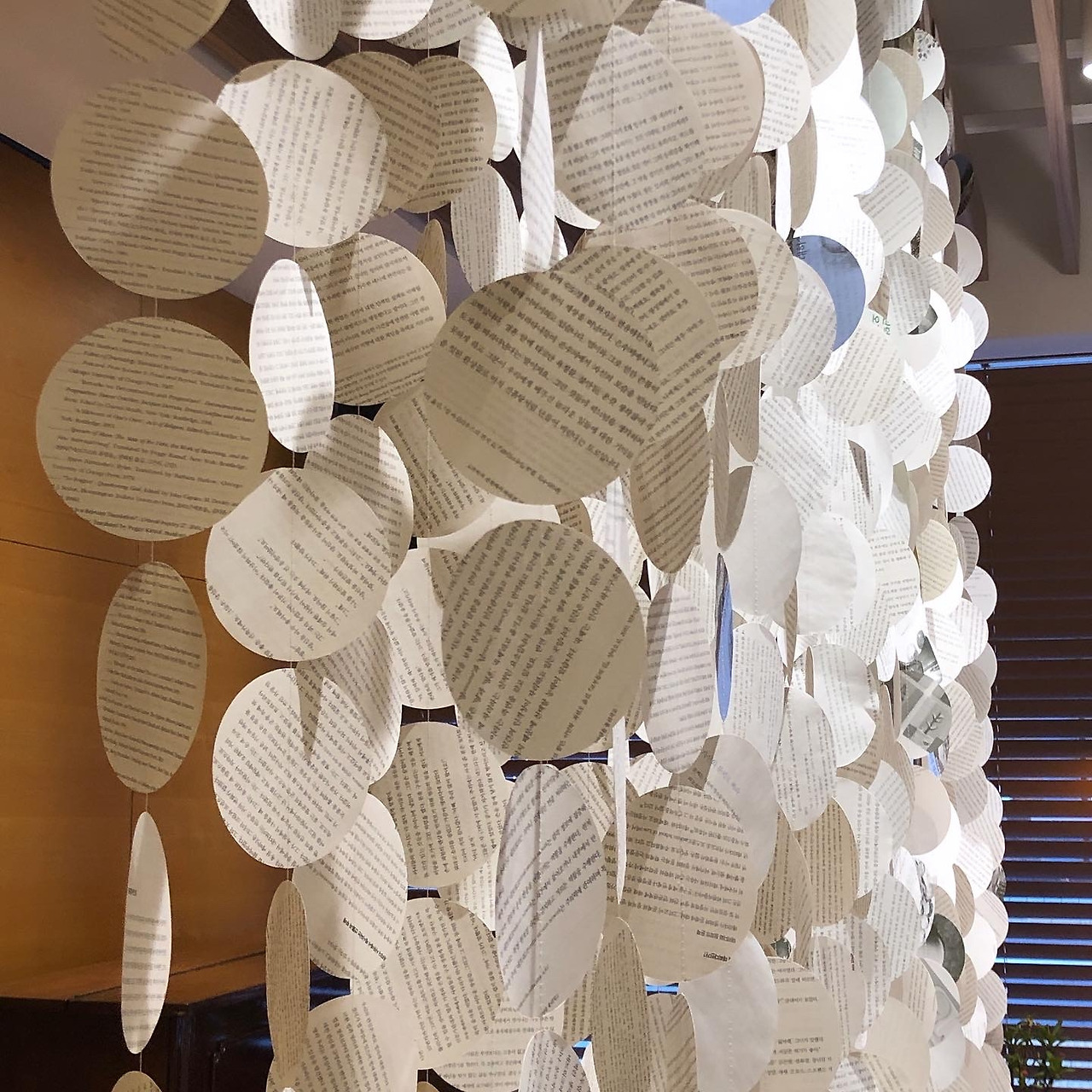 카페의 천장 높이를 고려해 길이를 정하고 양을 정했다. 무대의 너비만큼 한 줄로 건다면 너무 부피감이 없을까 봐 앞뒤로 지그재그로 걸기로 했다. 종이커튼이 완성되니 작은 박스에 접어 모두 들어갔다. 그 외 자잘한 문구류들을 챙겨 지하철을 타고 현장으로 갔다. 이동이 쉬웠고 설치도 간단했다. 카페 천장의 간살 사이에 테이프로 한 줄 한 줄 간격을 정해 붙이는 것이 설치의 끝이었다. 물론 이런저런 작은 장치(디스플레이용 소품류)들이 주변에 더 설치되긴 했지만.