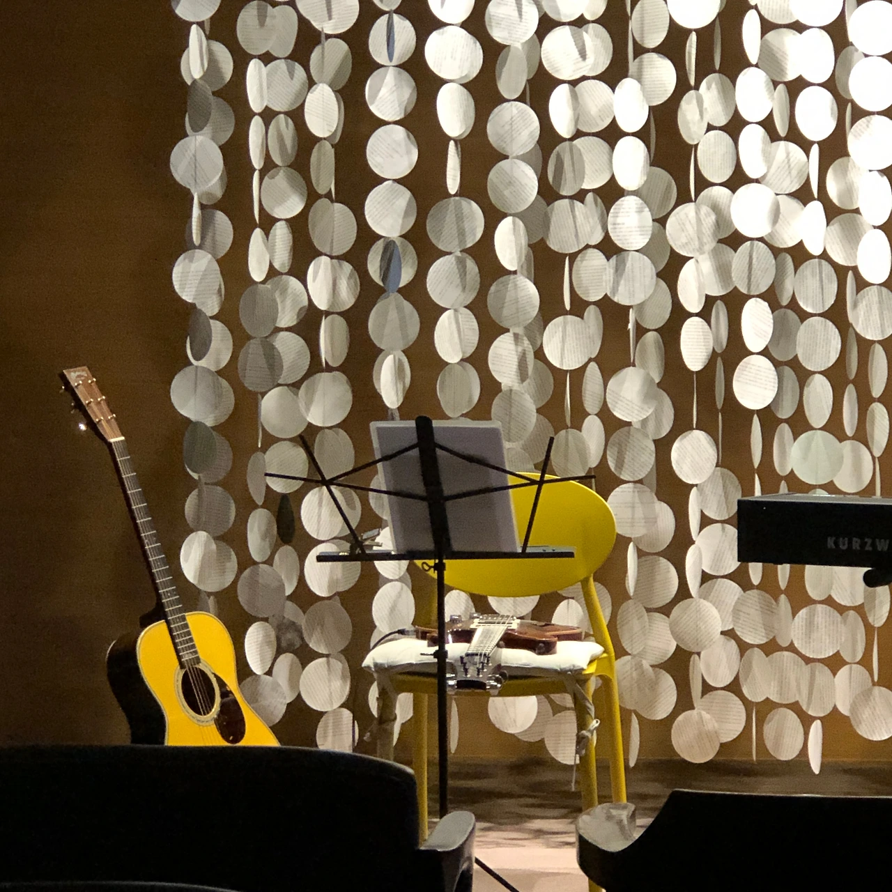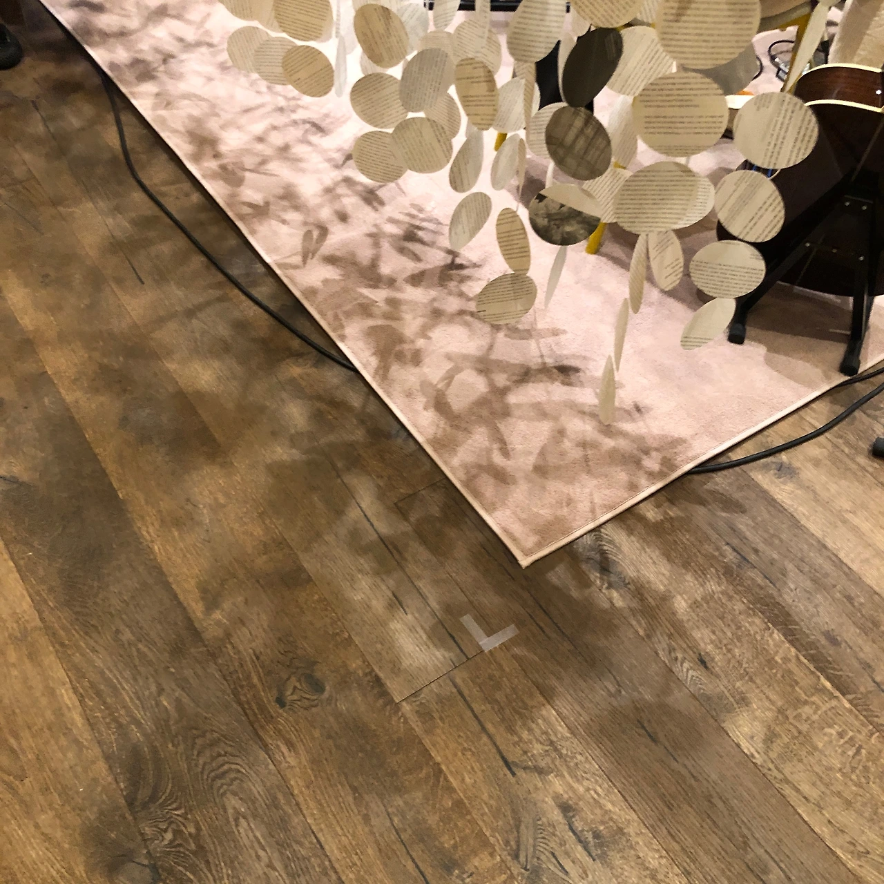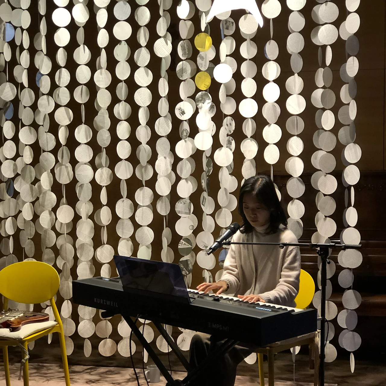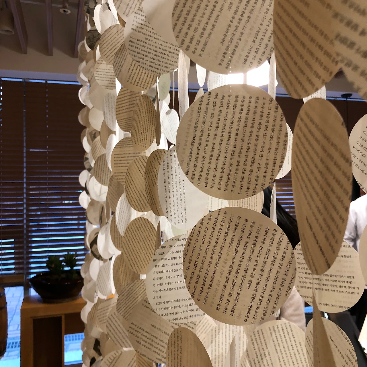 카페의 천장 높이를 고려해 길이를 정하고 양을 정했다. 무대의 너비만큼 한 줄로 건다면 너무 부피감이 없을까 봐 앞뒤로 지그재그로 걸기로 했다. 종이커튼이 완성되니 작은 박스에 접어 모두 들어갔다. 그 외 자잘한 문구류들을 챙겨 지하철을 타고 현장으로 갔다. 이동이 쉬웠고 설치도 간단했다. 카페 천장의 간살 사이에 테이프로 한 줄 한 줄 간격을 정해 붙이는 것이 설치의 끝이었다. 물론 이런저런 작은 장치(디스플레이용 소품류)들이 주변에 더 설치되긴 했지만.