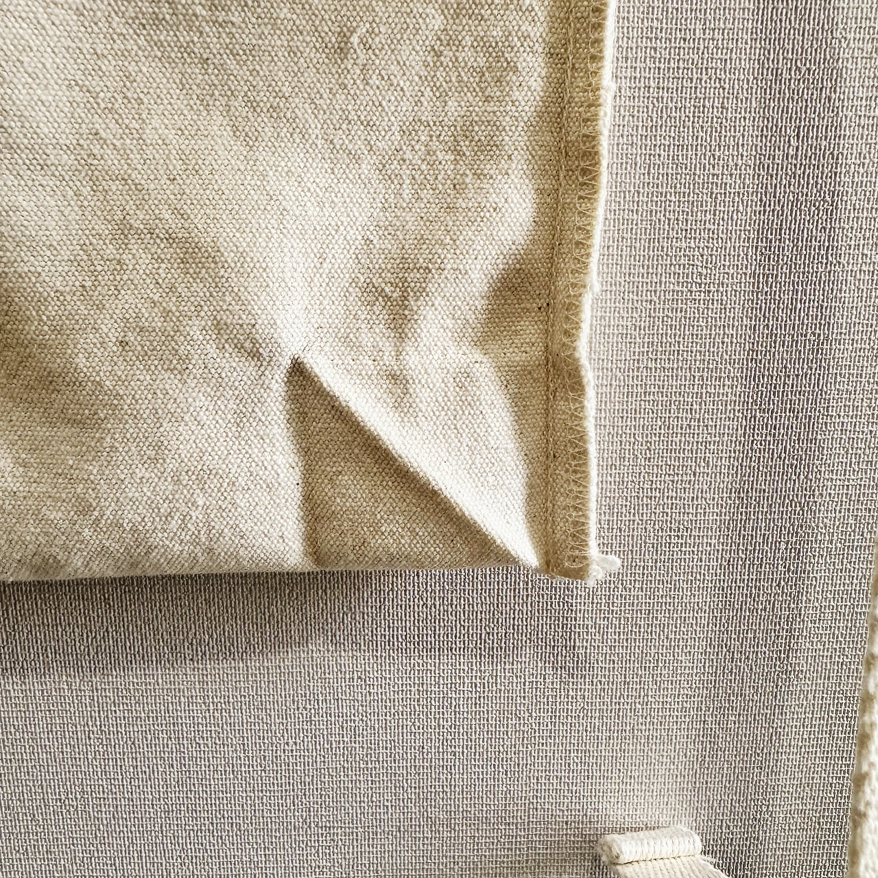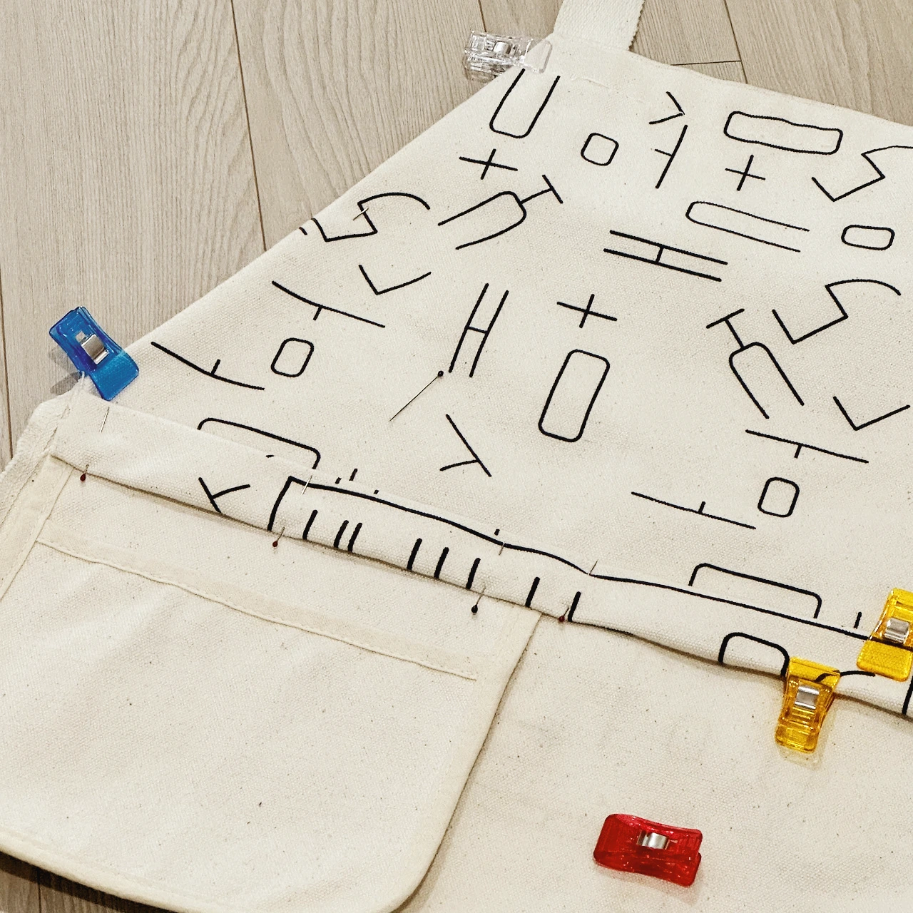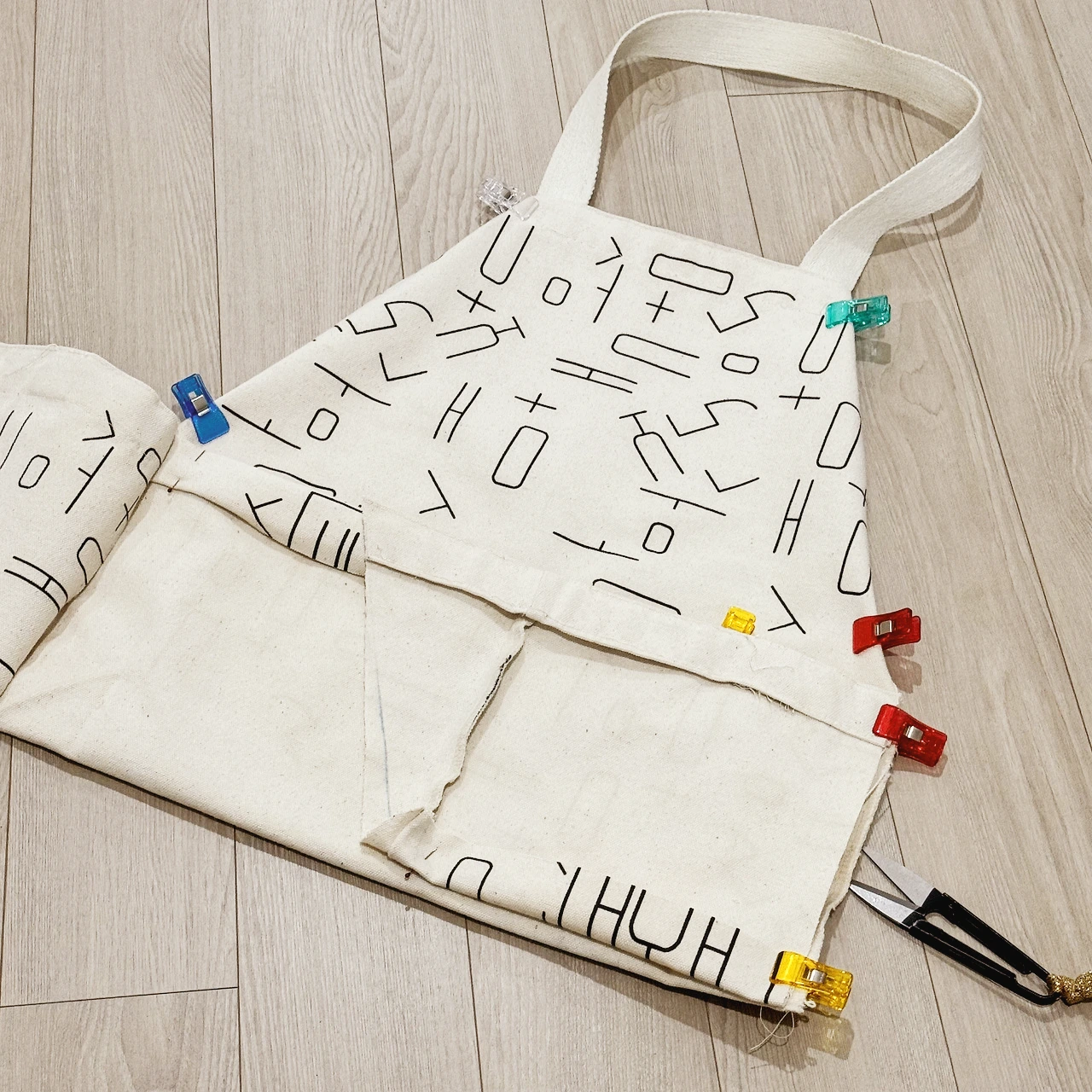 보통 가방을 뒤집어 양쪽 봉제 부분을 자르고 시작하는데 이번엔 가방을 뒤집어 봉제선을 다 자르지 않았다. 밑부분을 이용해 그대로 뒤집으면 주머니가 될 수 있을 것 같다는 아이디어가 떠올랐기 때문이다. 가방의 밑면 모서리 부분(삼각형으로 박힌 부분)의 실밥을 풀어 납작한 가방으로 만들어 둔 다음, 가방의 뒷면의 1/2 정도의 면적은 남겨두고 자랐다. 잘라낸 천은 앞치마의 옆부분으로 붙이려는 생각 했다. 그대로 뒤집으니 가방의 안쪽이었던 면, 가방의 밑면이 그대로 주머니의 형태가 되었다. 그래서 에코백 사이즈 그대로 사용하는 작은 앞치마가 되었다.