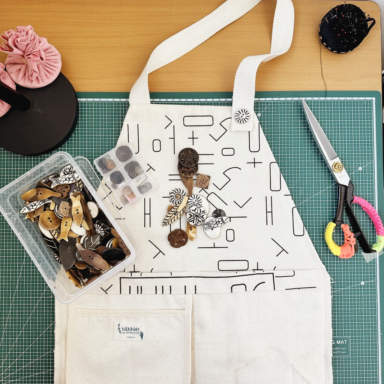 뒷면을 자르고 남은 1/2의 천을 양 옆에 붙여 보려다가 말았다. 이것만으로도 작지만 깔끔한 앞치마인 것 같았다. 군더더기는 필요 없었다. 목부분의 끈이 약간 짧은 것 같아서 한쪽 봉제선을 풀고 단추로 마무리하면서 기존끈을 늘렸다. 마침 공정무역 뿔단추가 있었다. 검정라인 패턴과 어울리는 단추다.
