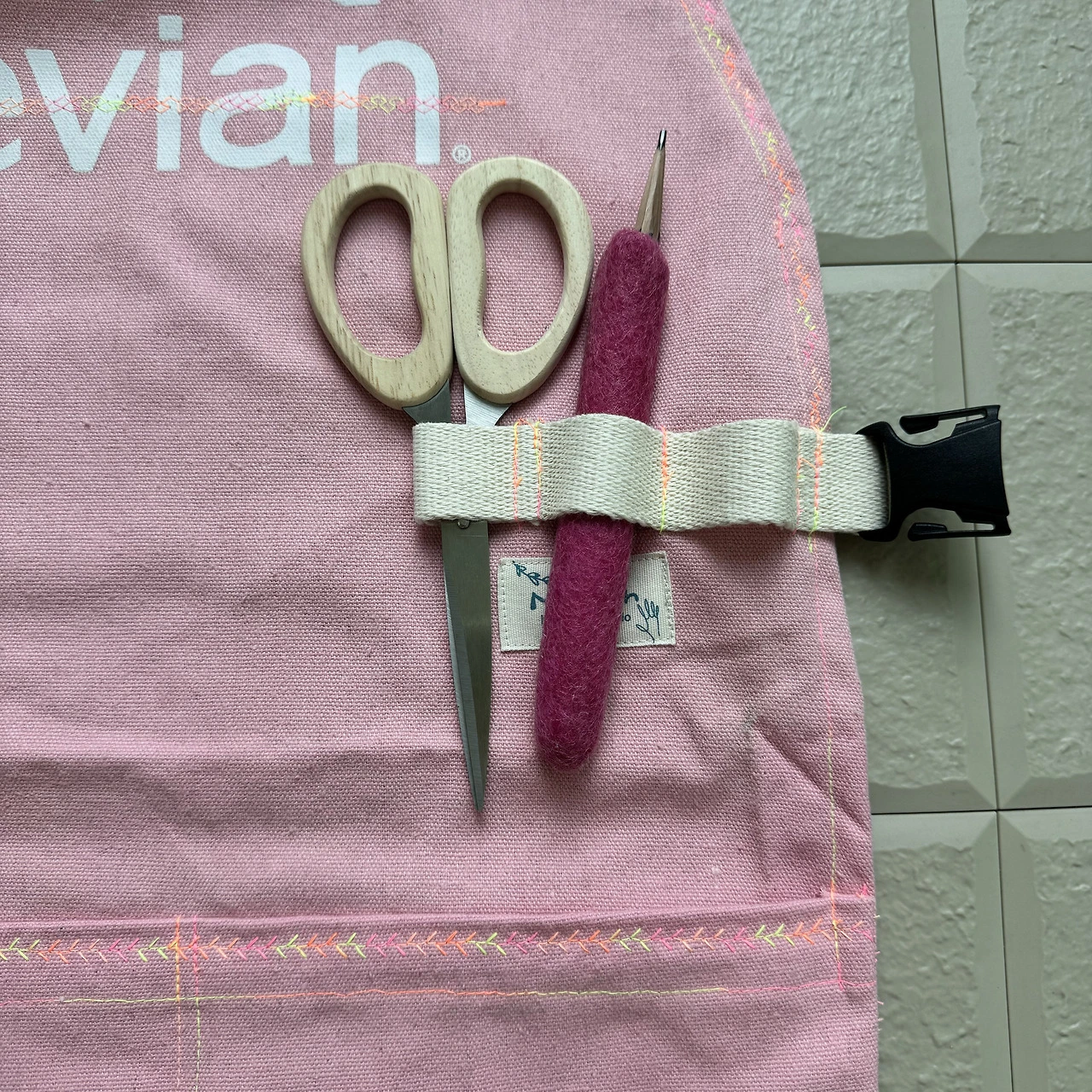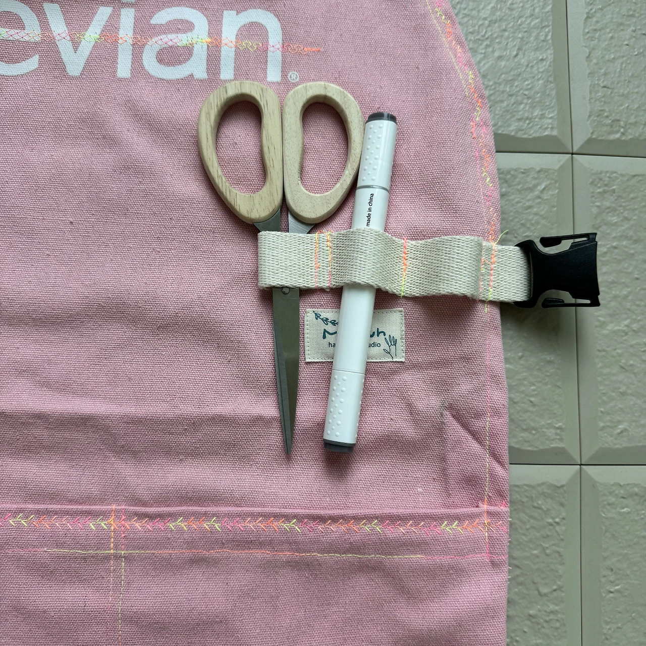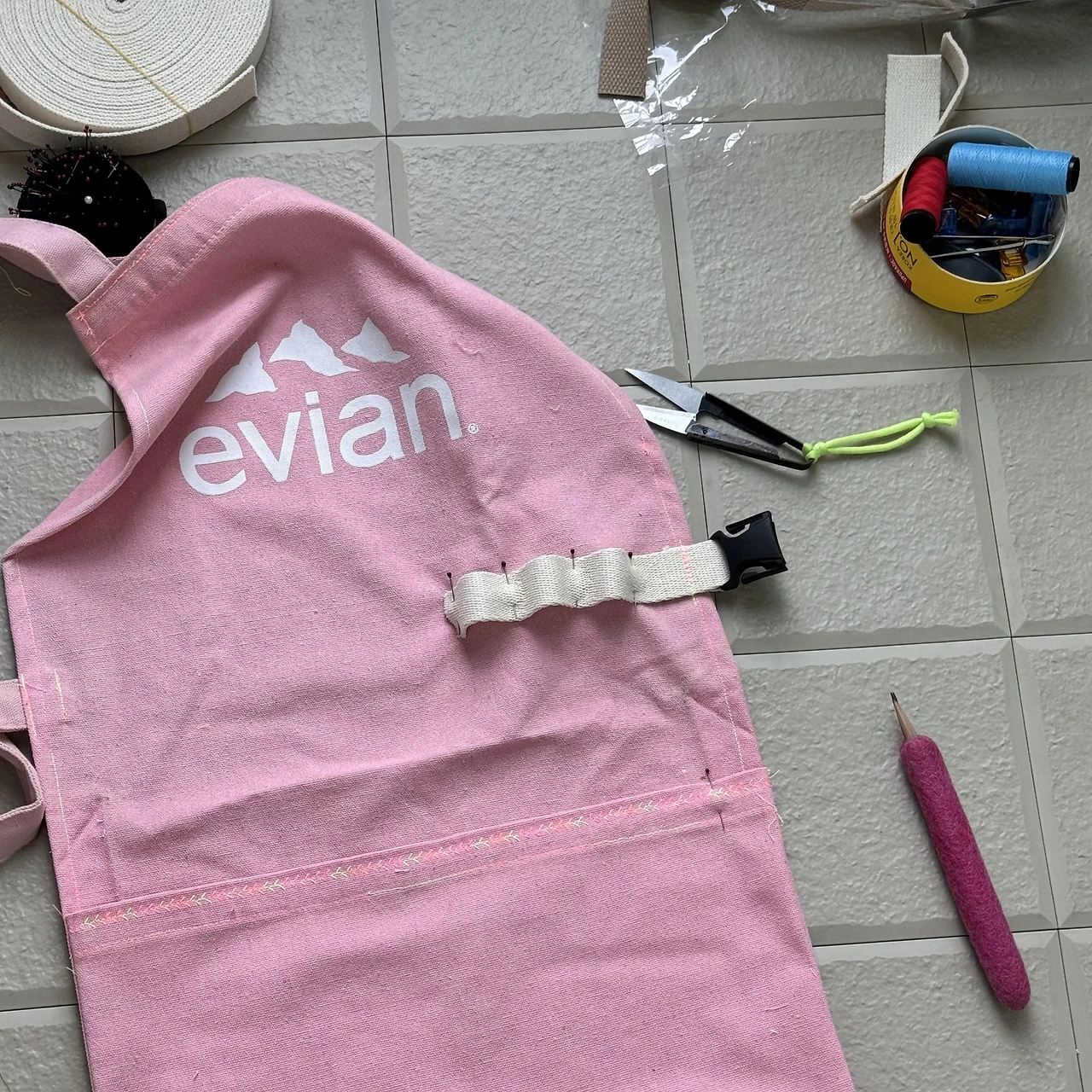 주머니의 위치를 정하고 부속적인 디자인들을 했다. 포인트로 재봉자수모양을 넣어 보았다. 핑크랑 나름 어울린다. 그리고 버클을 달 끈으로 도구 고리도 만들었다. 이 고리들 생각보다 쓸모 있다.