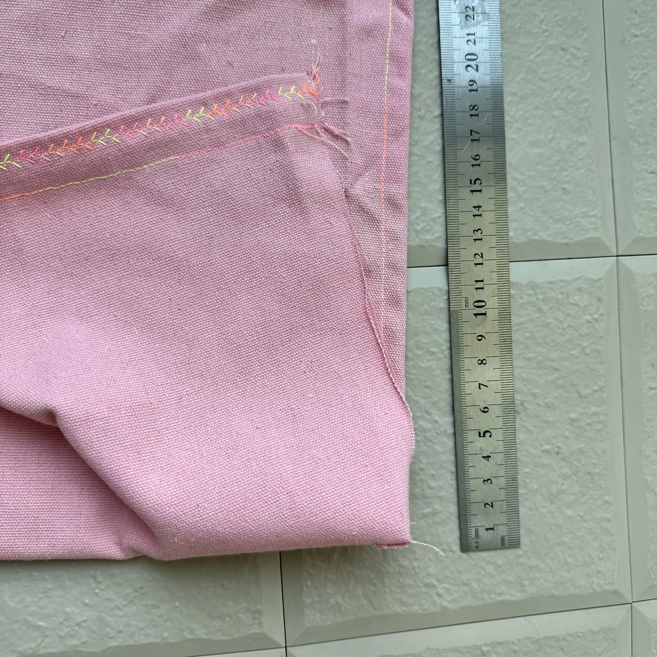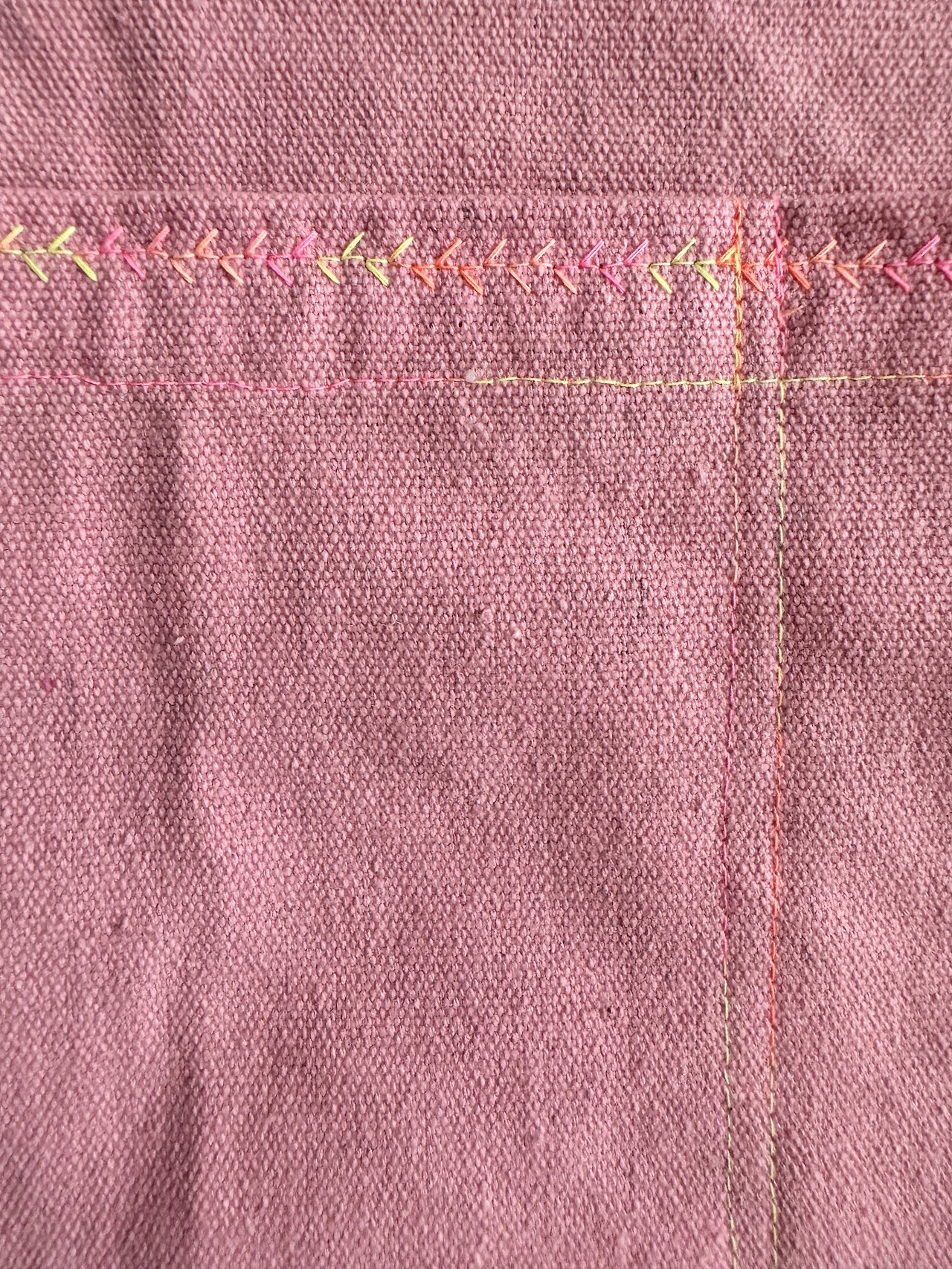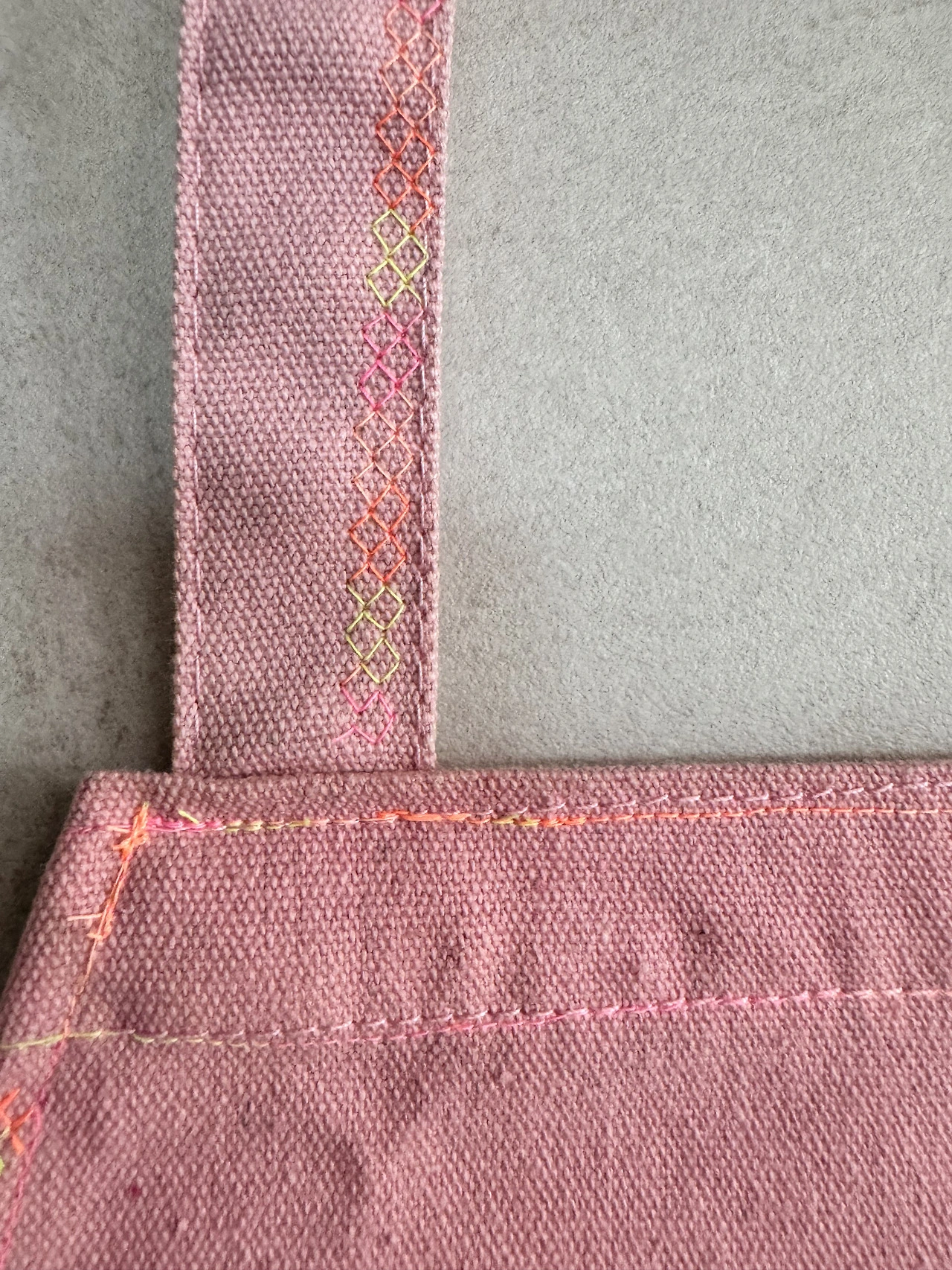 주머니의 위치를 정하고 부속적인 디자인들을 했다. 포인트로 재봉자수모양을 넣어 보았다. 핑크랑 나름 어울린다. 그리고 버클을 달 끈으로 도구 고리도 만들었다. 이 고리들 생각보다 쓸모 있다.