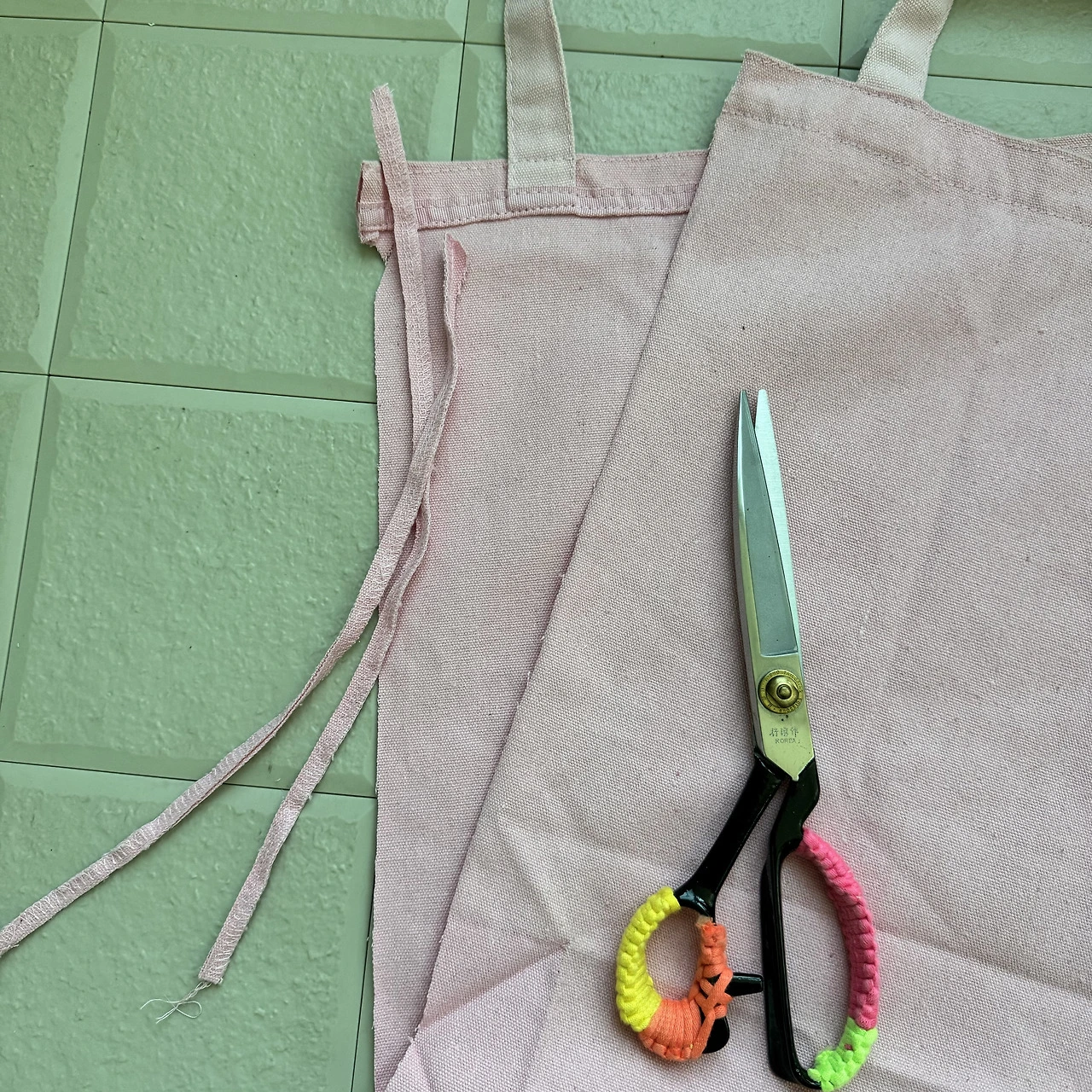 옆선은 잘라내고 손잡이의 간격이 너무 멀어서 손잡이 부분도 일단 뜯어 내었다. 안쪽 바이어스 부분을 끼어내고 싶었지만 참았다. 나의 작업은 최소한의 쓰레기를 만드는 것 또한 미션이었다.