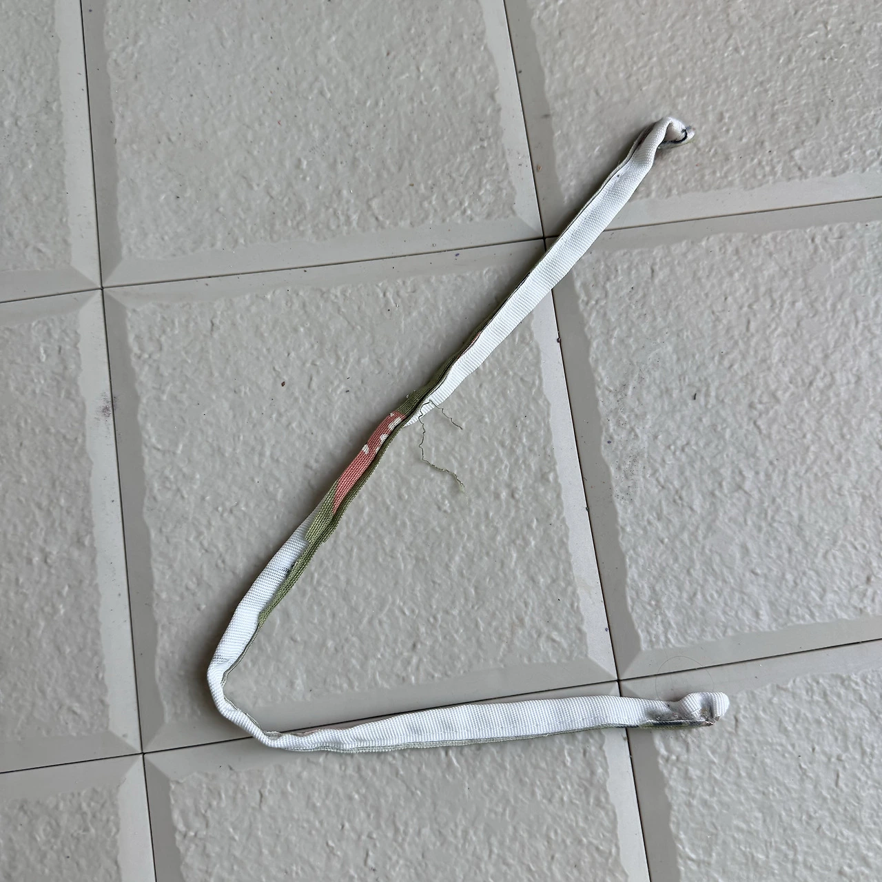 가방을 뒤집어 한쪽 면의 정 중앙을 자르고 아래면도 잘라 주었다. 펼치면 가로로 긴 형태의 사각형 원단이 된다. 이 원단의 양끝에 떼어둔 손잡이를 달아준다. 이번엔 허리끈으로 활용하려고 한다.