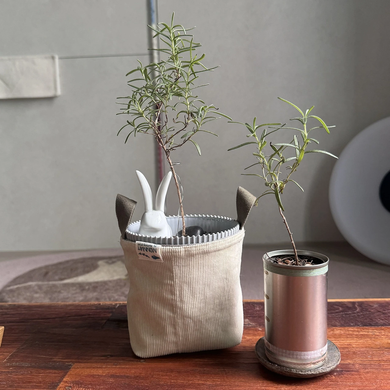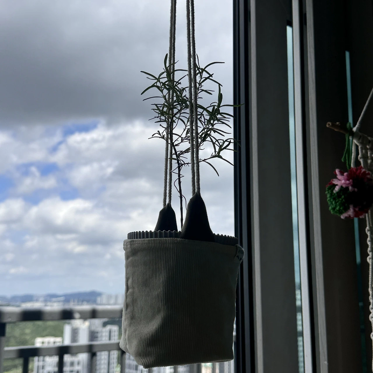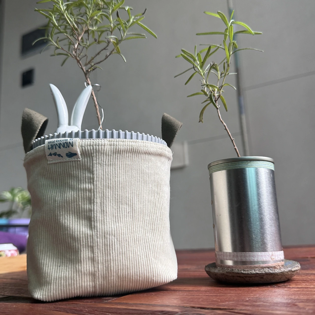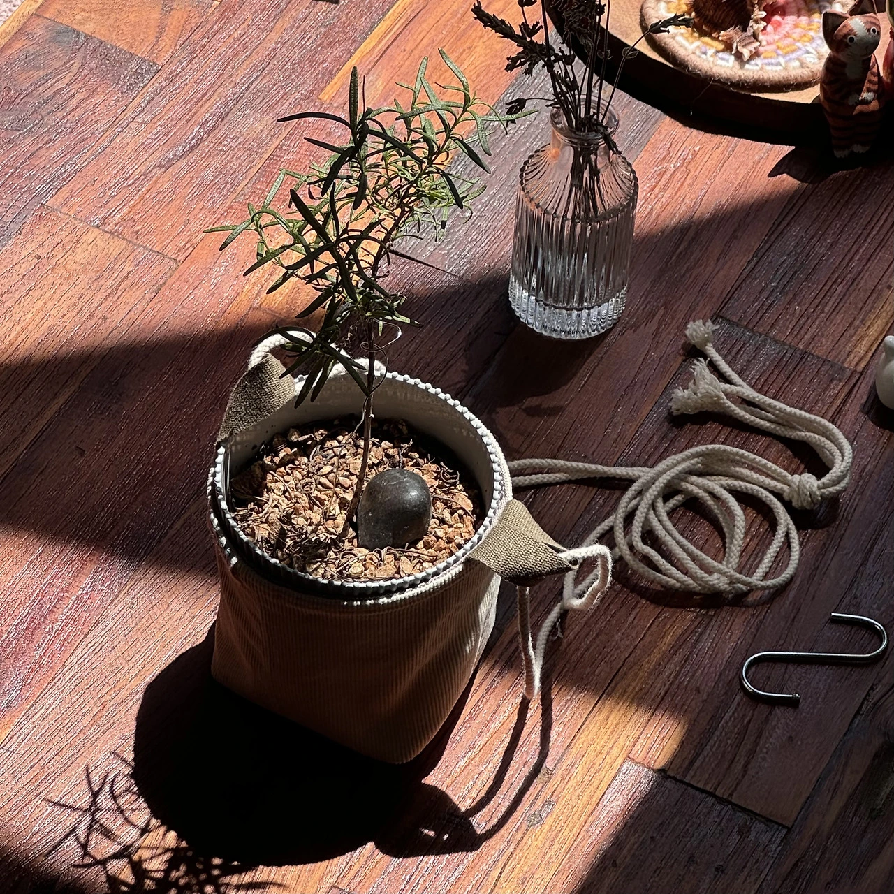 바지단 2장 중 한 장은 뒤집어 겹치면 된다. 밑둥부분은 접어 박아 입체로 설 수 있게 만들었다. 작은 고리를 양쪽에 달아 S고리에 걸어서 잡동사니를 담는 포켓으로 쓸 수 있고 작은 화분커버나 화분을 행잉(Hanging)하게 만들 수도 있다.