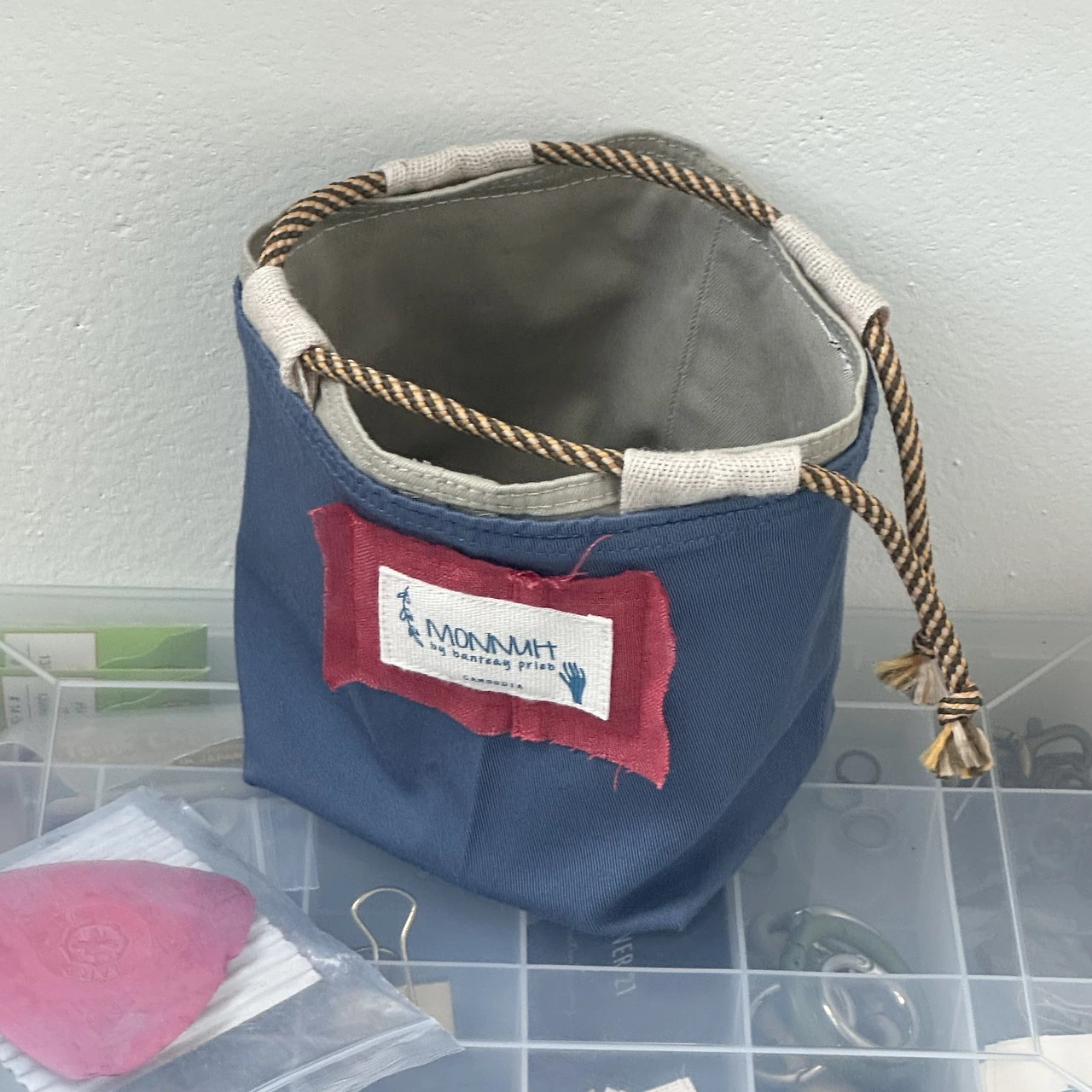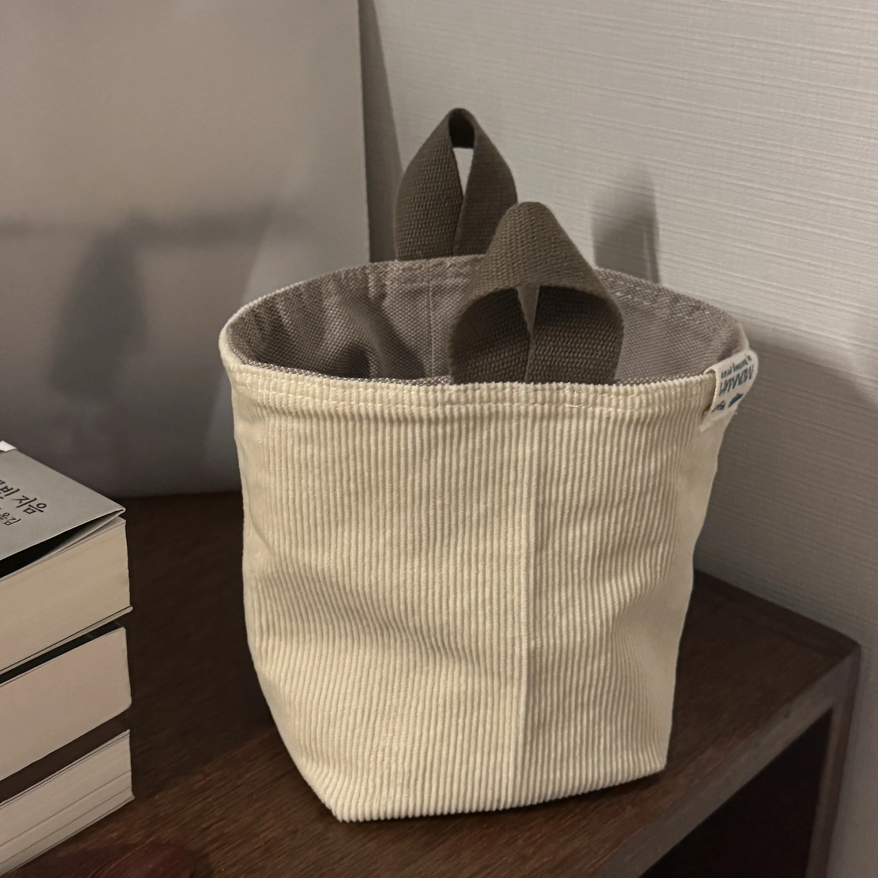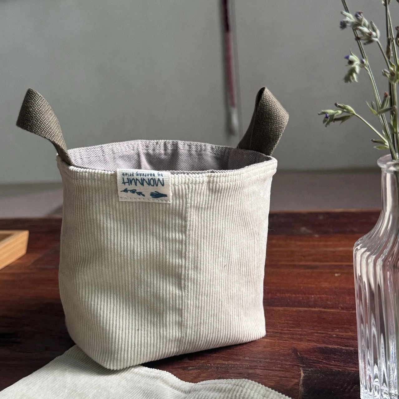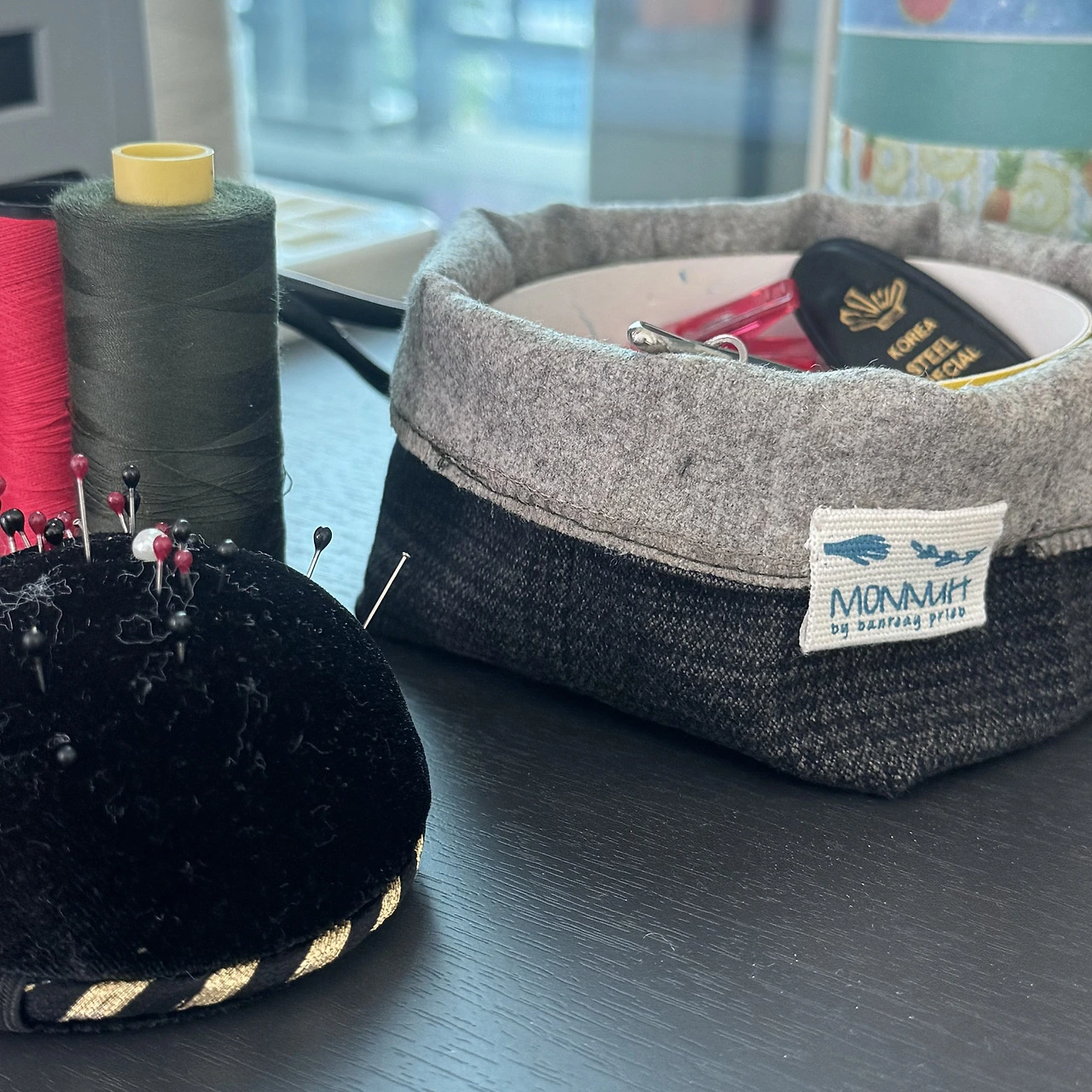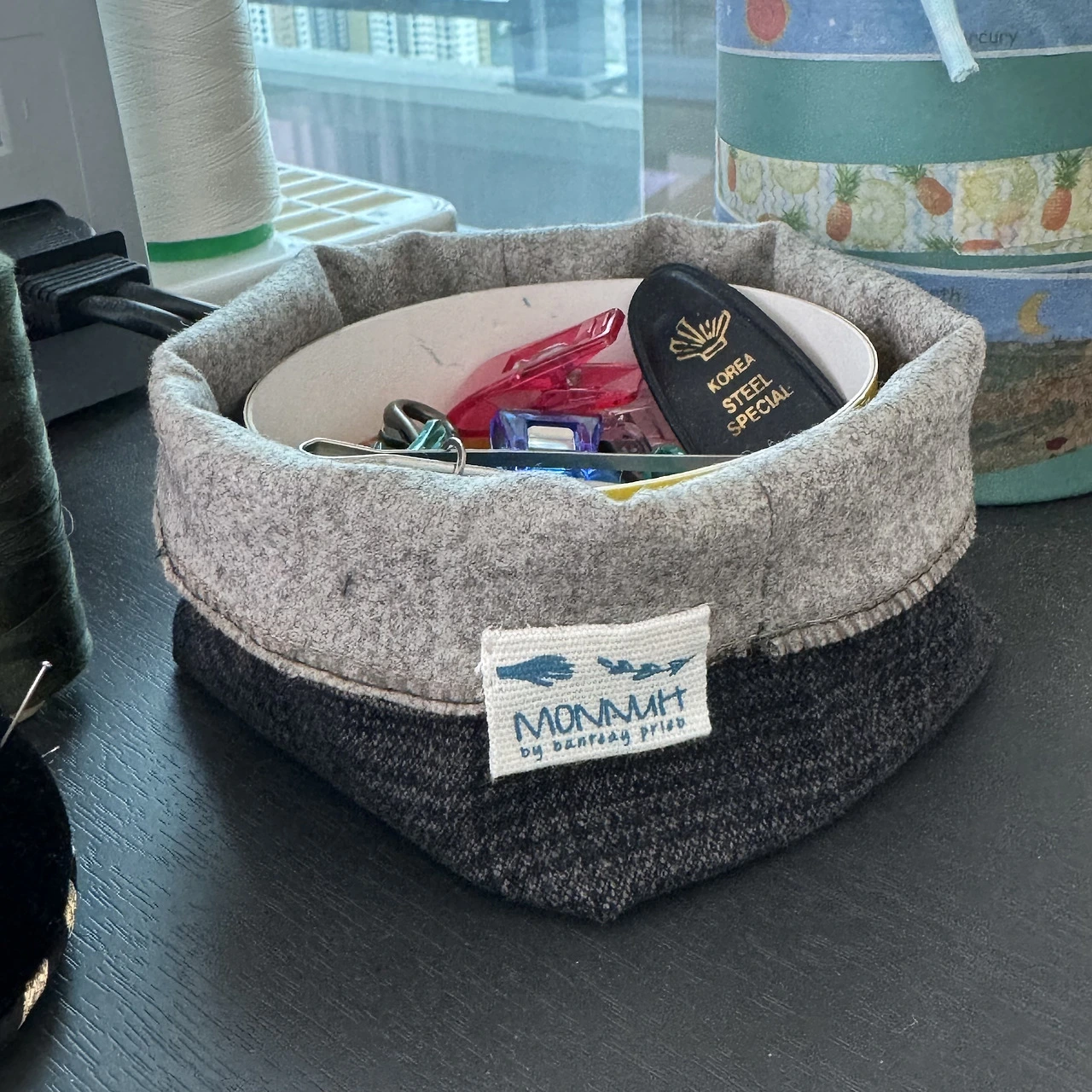 바지단 2장으로 간단히 만든 원포켓. 작은 바구니 형태로 굴러다니는 소품들 정리하기 편하다.