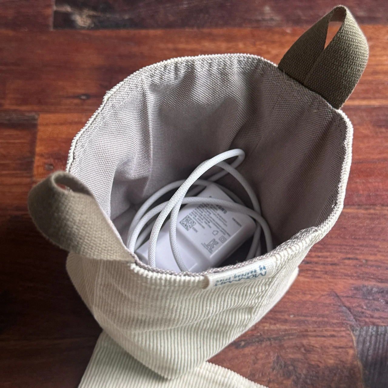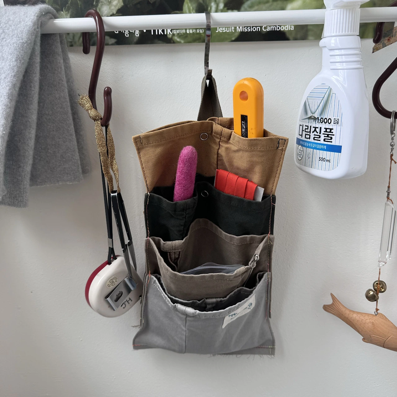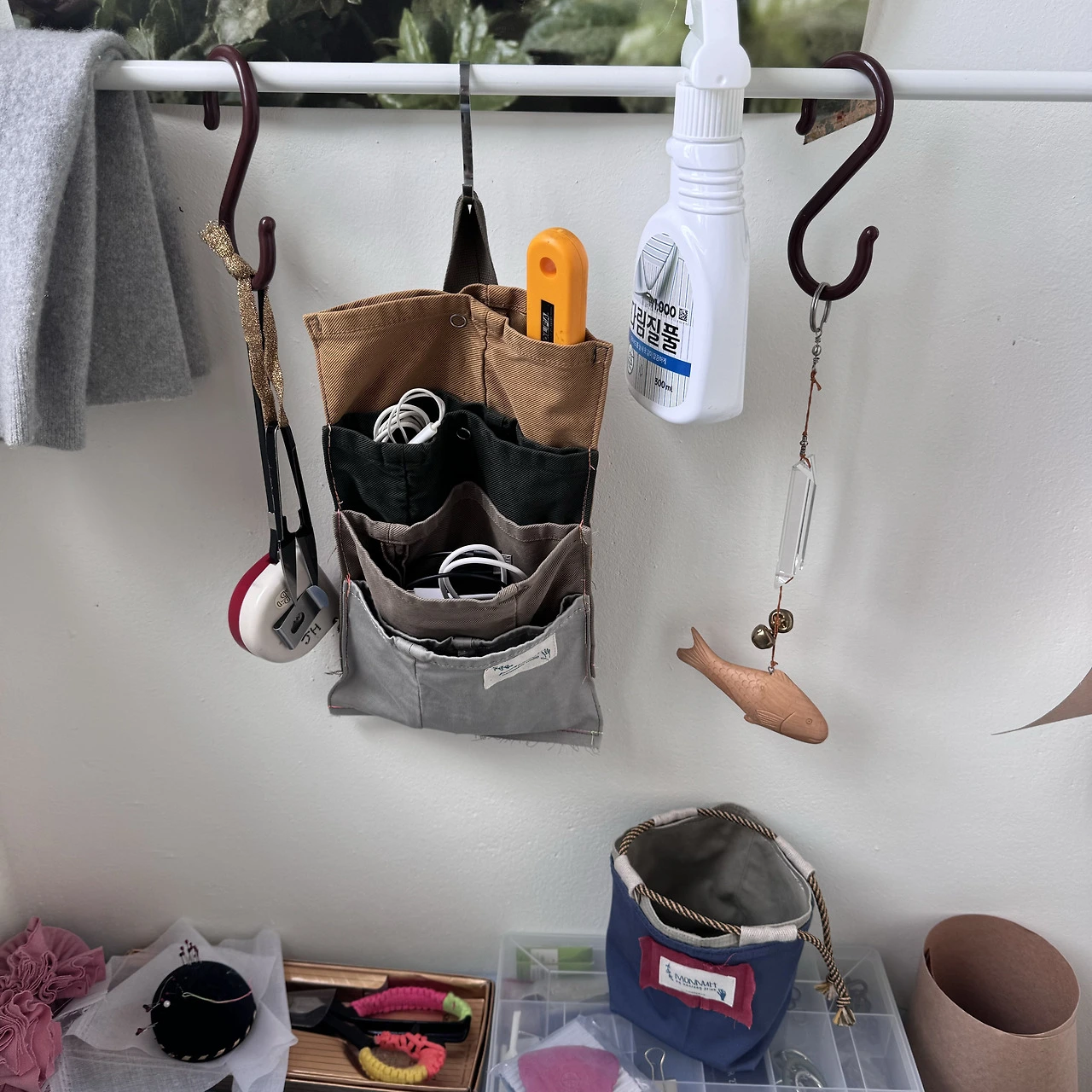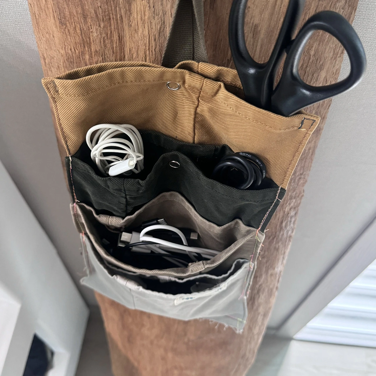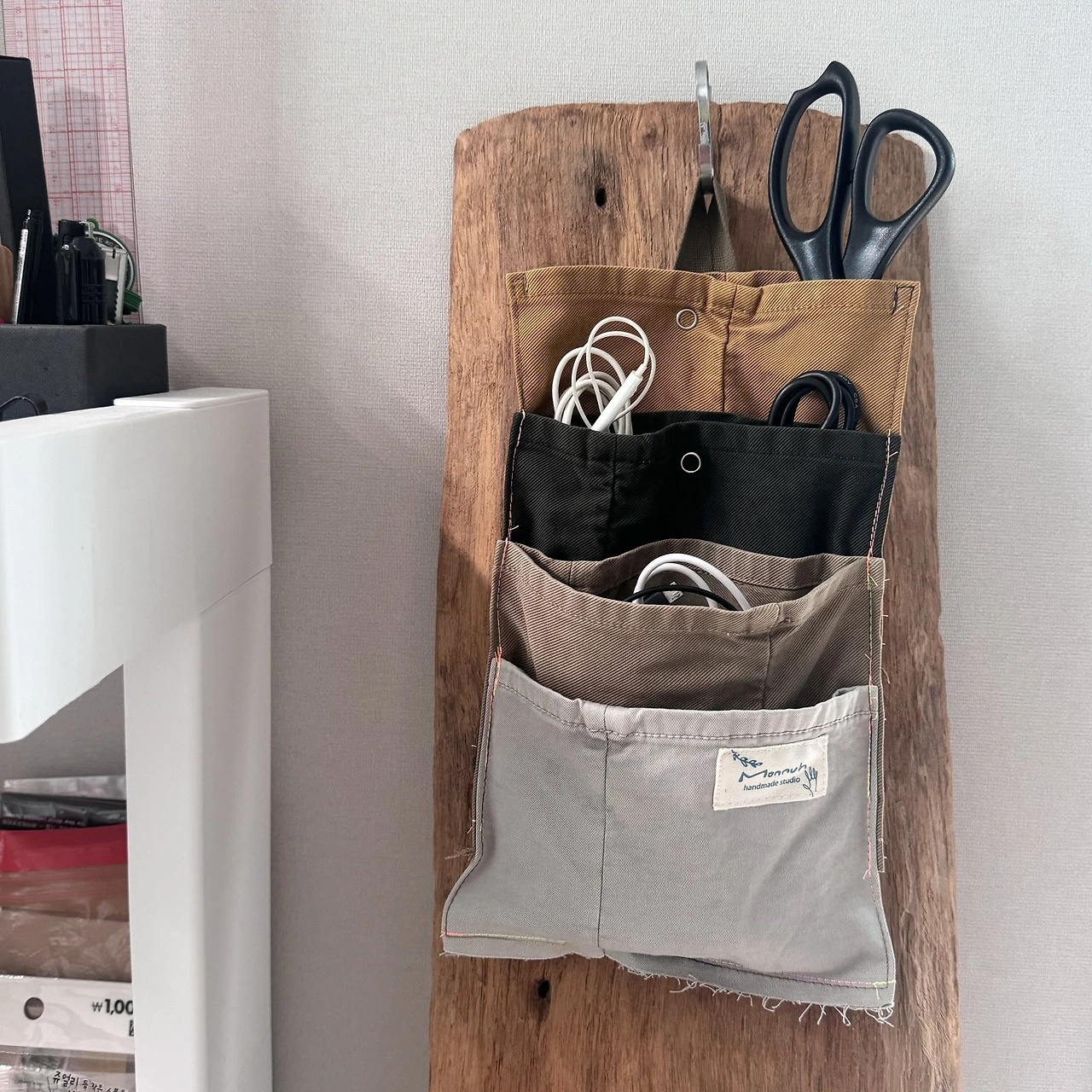 한쪽을 박아 막으면 주머니 형태로 쓸 수 있겠다는 생각에 월포켓을 만들어 보았다. 길이가 비슷한 4개의 바지단을 연달아 이어 붙이면 끝! 컴작업 테이블 옆에 두고 쓴다면 각종 충전줄들을 넣어 보관하면 좋겠다. 박스에 넣어두면 꺼낼 때마다 엉킨 줄들 사이에서 내가 필요한 줄을 찾아야만 했다. 이렇게 각 포켓에 넣어두면 찾기 편하겠다. 말아두기 짧은 충전줄은 따로 큰 포켓에 몰아넣어 두었다. 중간에 똑딱단추를 달아 넣는 물건에 따라 열고 닫으며 쓸 수 있다.