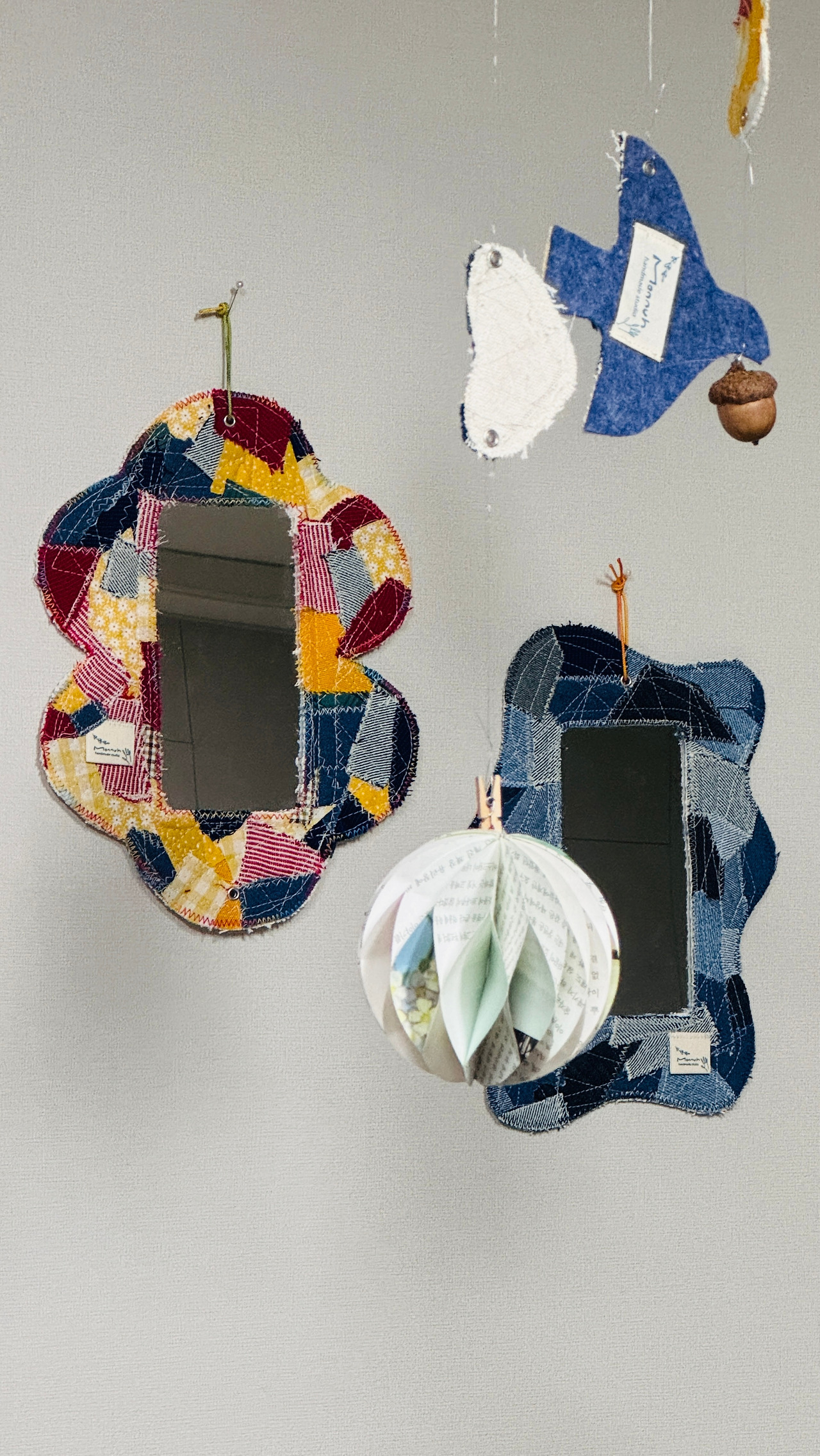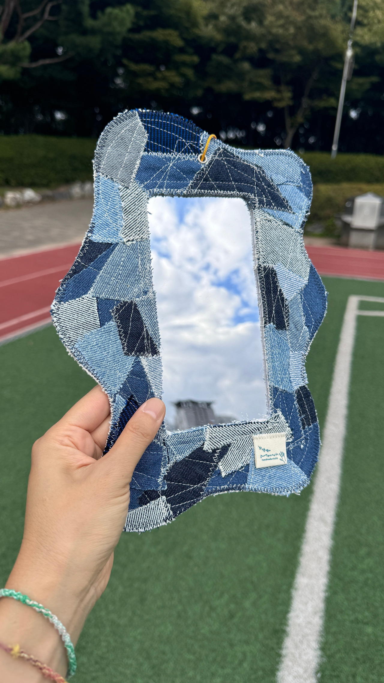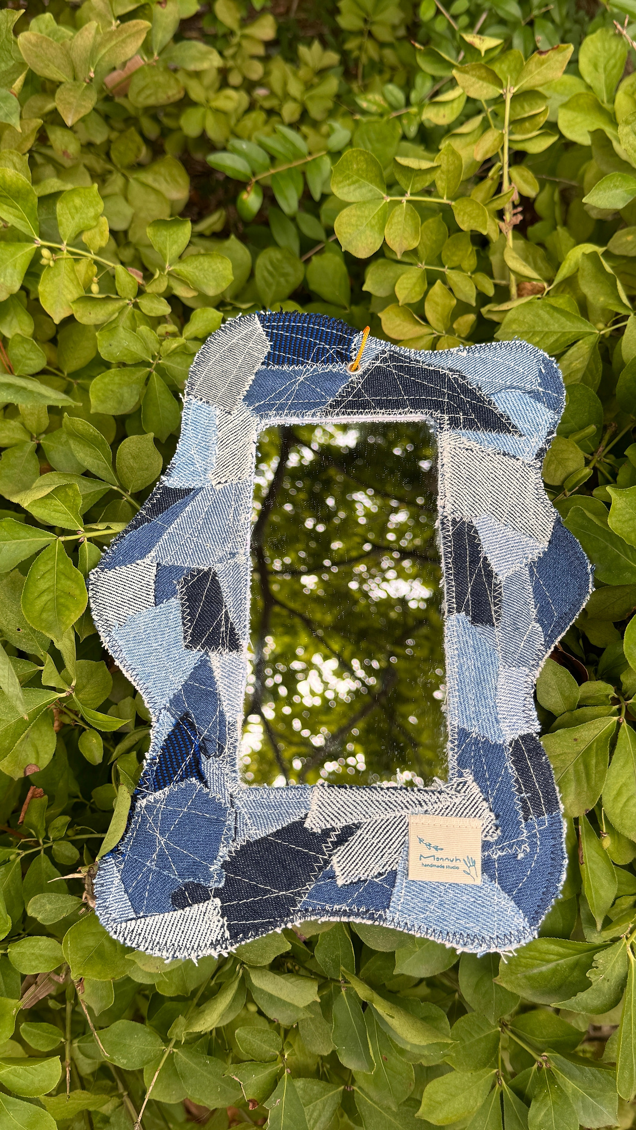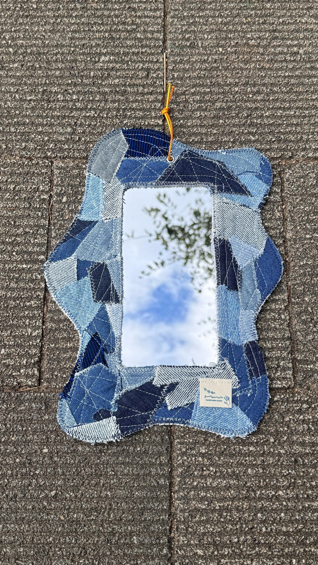 버려진 청바지와 자투리 천으로 만든 벽거울은 원단의 부드러움을 닮은 웨이브 모양을 하고 있다. 차갑고 딱딱한 네모난 거울을 감싸고 있는 웨이브는 세상을 부드럽게 만들고 싶은 마음의 표현이다.