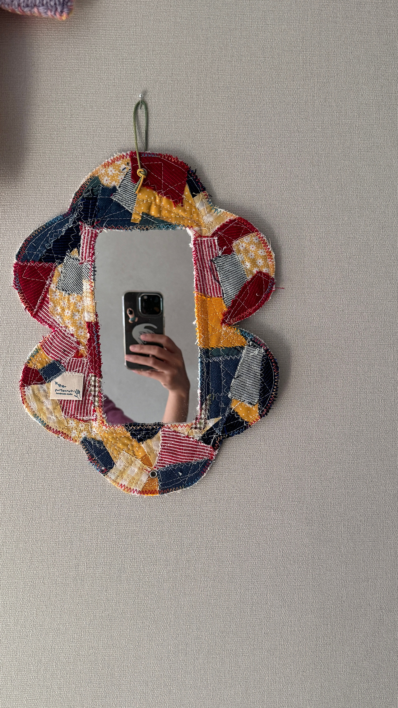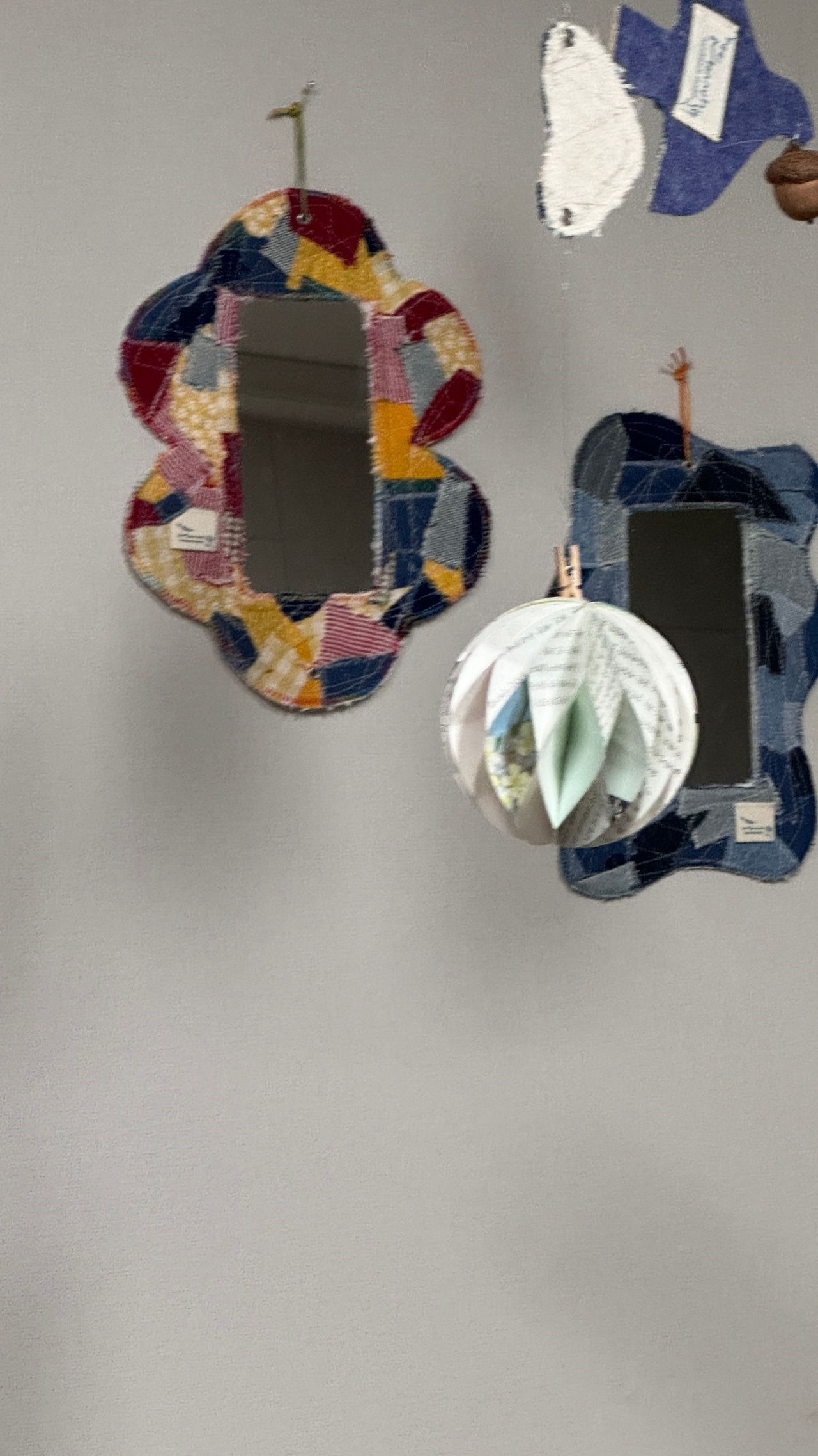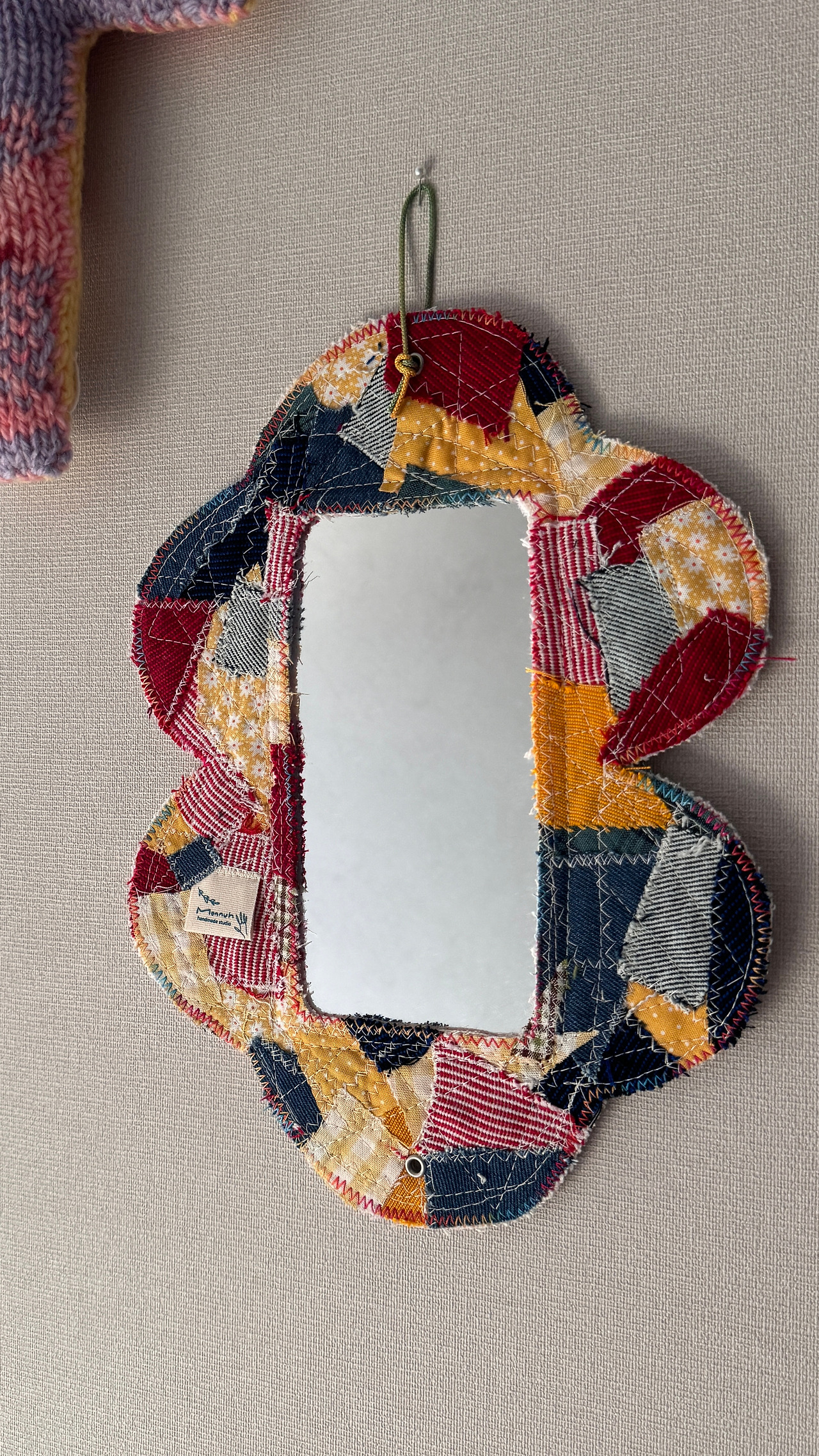 버려진 청바지와 자투리 천으로 만든 벽거울은 원단의 부드러움을 닮은 웨이브 모양을 하고 있다. 차갑고 딱딱한 네모난 거울을 감싸고 있는 웨이브는 세상을 부드럽게 만들고 싶은 마음의 표현이다.