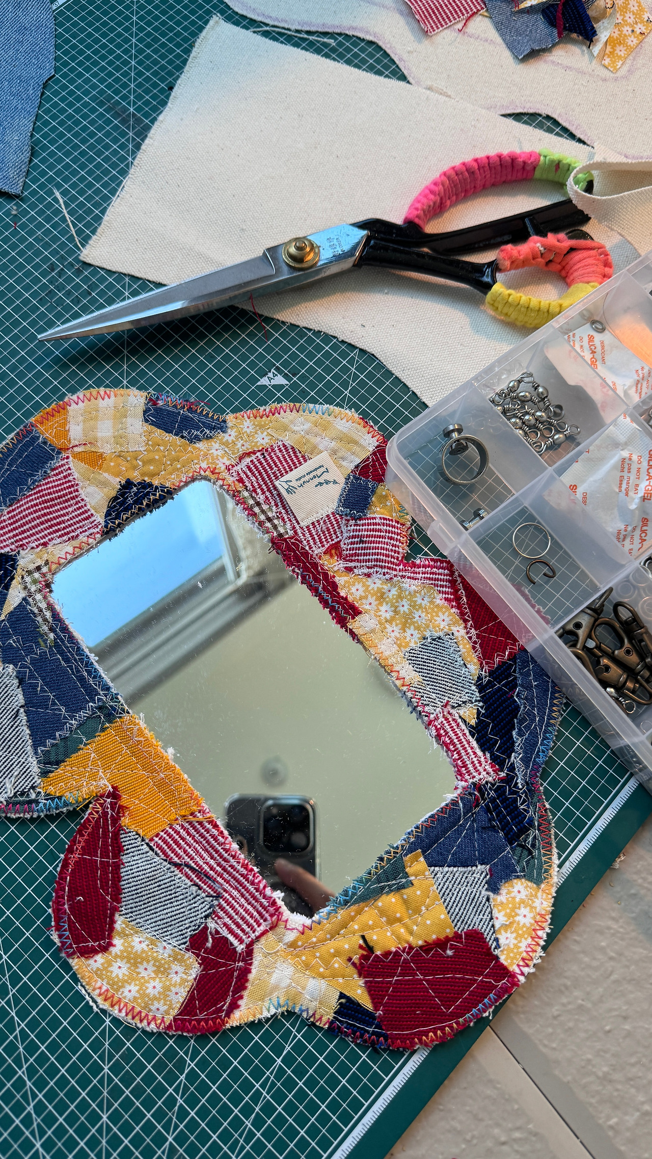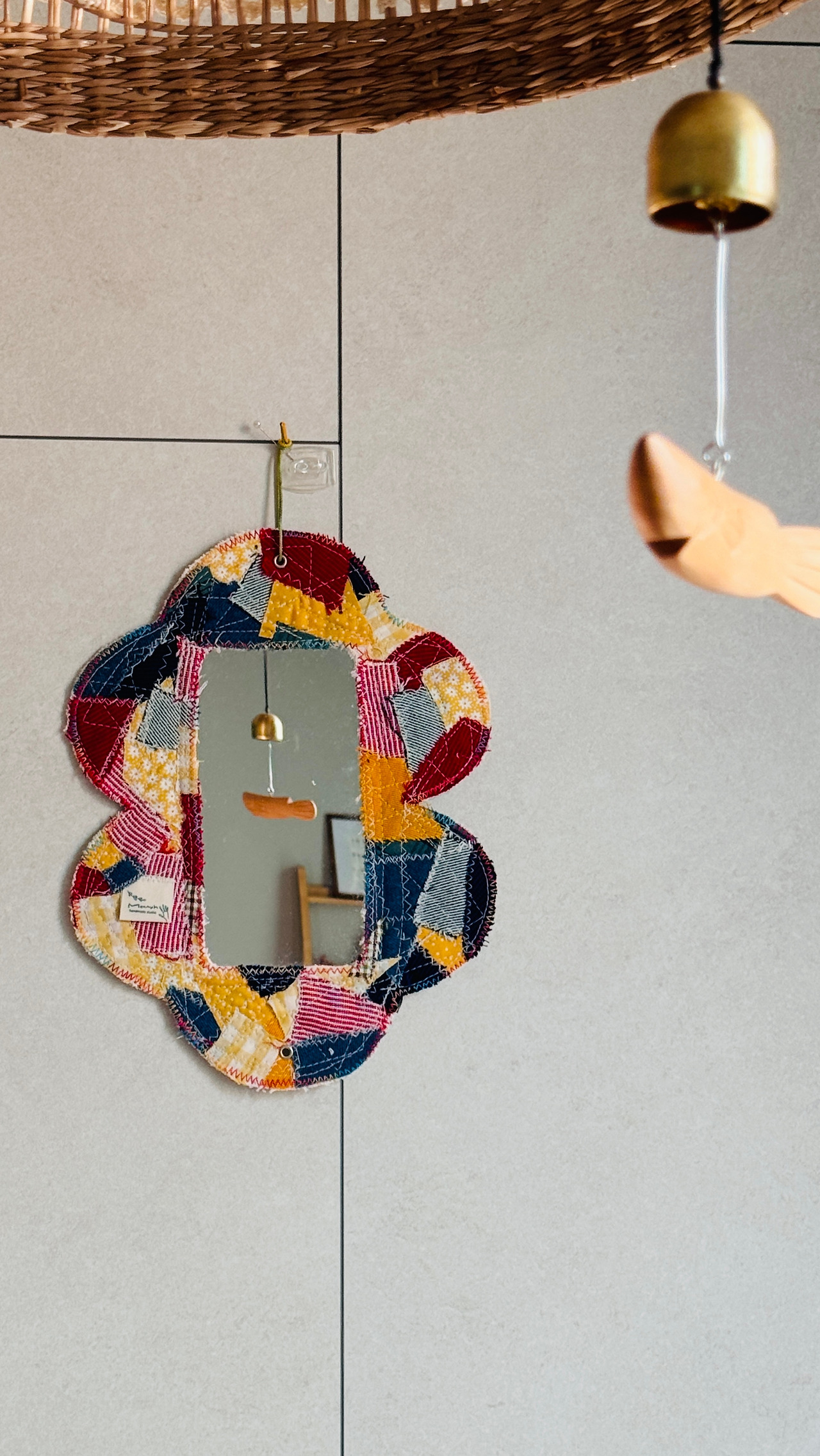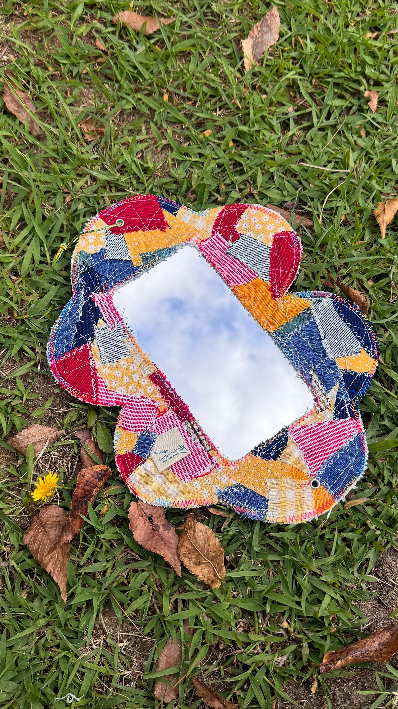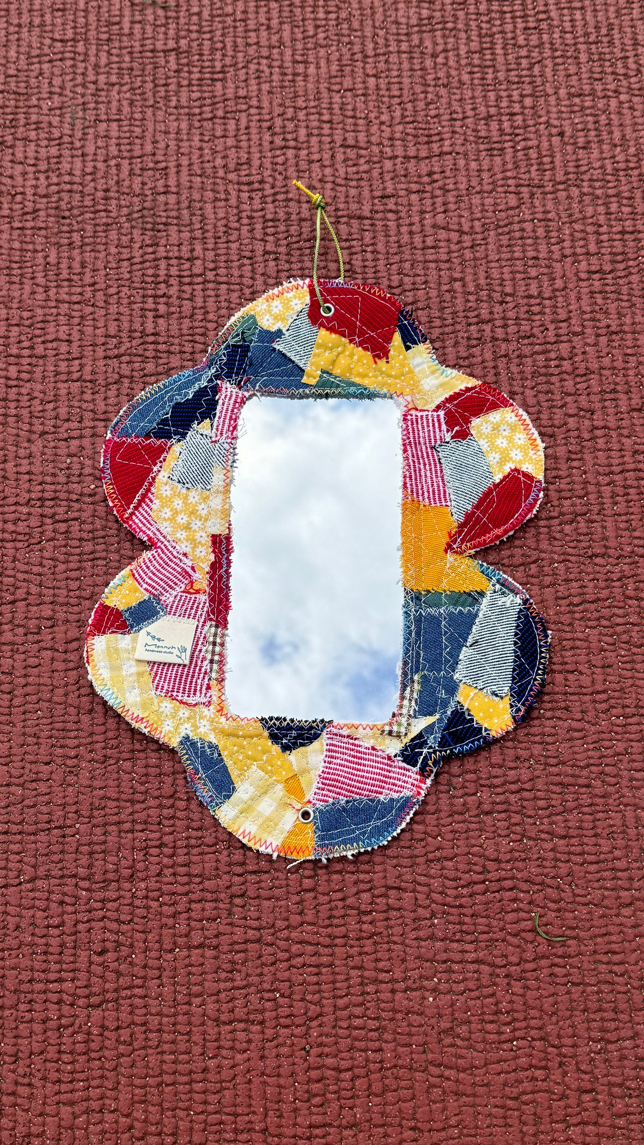 버려진 청바지와 자투리 천으로 만든 벽거울은 원단의 부드러움을 닮은 웨이브 모양을 하고 있다. 차갑고 딱딱한 네모난 거울을 감싸고 있는 웨이브는 세상을 부드럽게 만들고 싶은 마음의 표현이다.