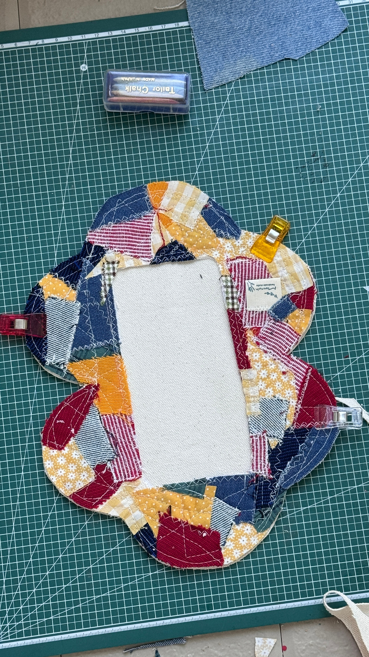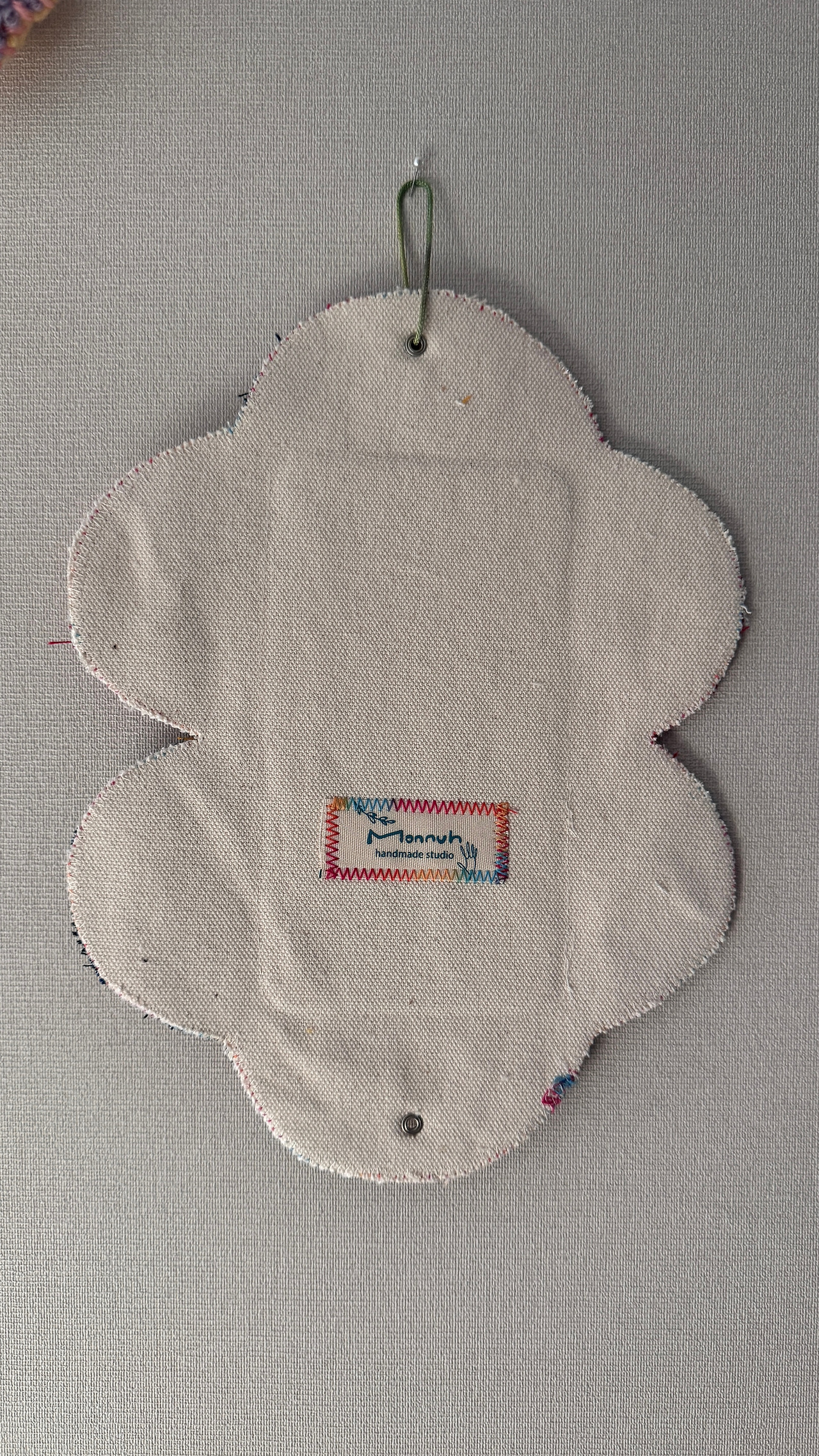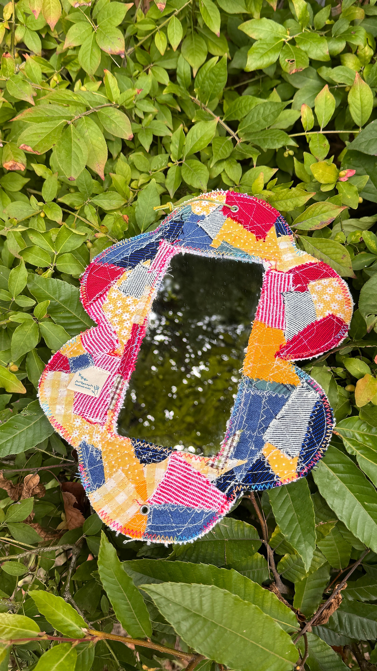 아주 작은 천조각들까지 활용할 수 있다. 조각보처럼 이어진 것이 아니라 서로 겹쳐 눌러 박았다. 도톰한 질감과 알룩달록한 색들이 기분 좋게 함께 하고 있는 느낌이다.