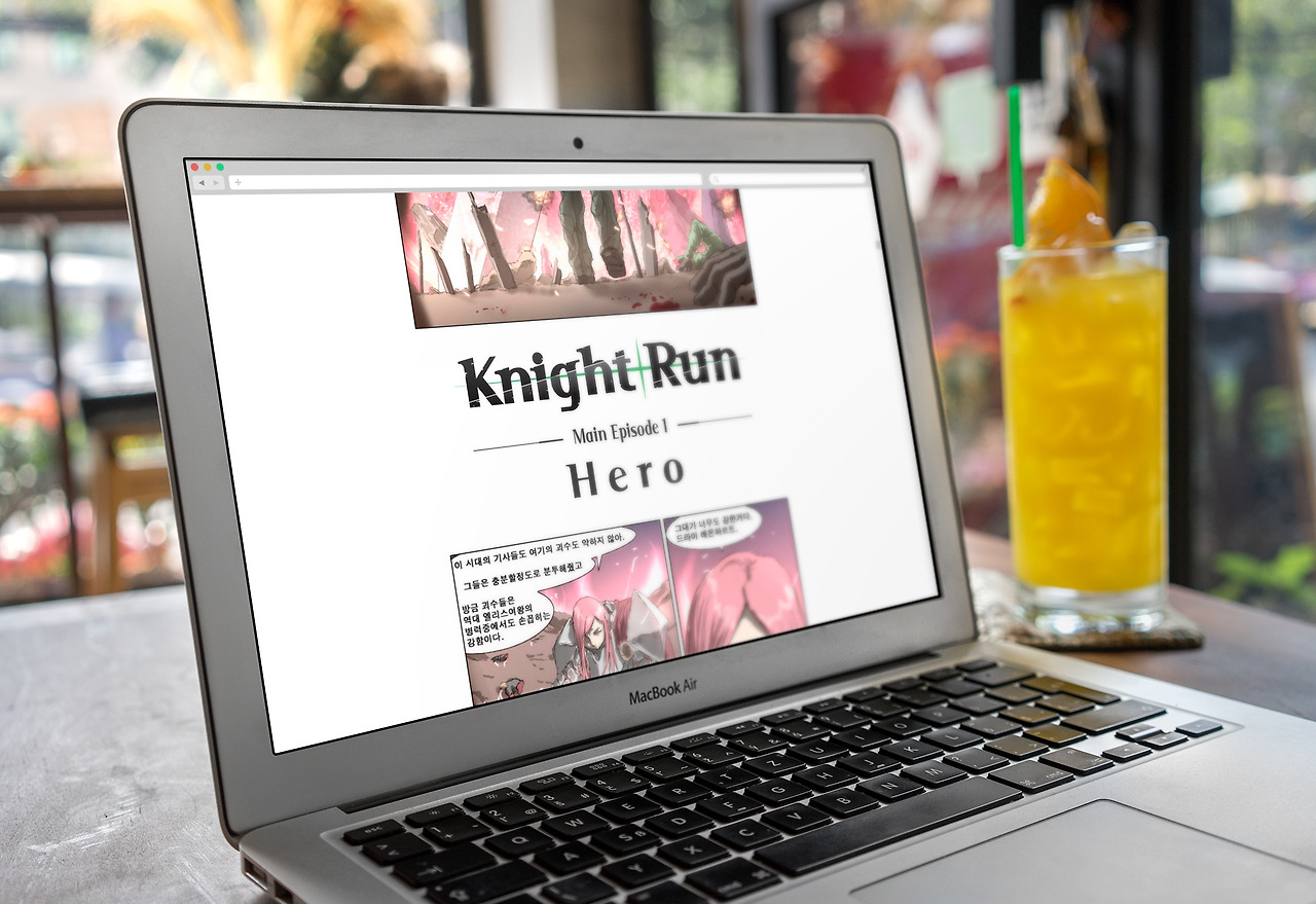 에피소드 정보는 로고 바로 아래에 작게 배치하였습니다. 그 양옆에 앤의 무기 AB소드를 상징하는 아이콘을 배치해서 나이트런의 브랜드 이미지를 강화 시켰습니다. 그리고 맨 아래에는 에피소드 제목을 크게 입력하도록 하여, 사용자들이 자신이 보고 있는 웹툰의 이름이 뭔지, 이번 에피소드는 메인 에피소드인지, 외전인지, 에피소드의 이름은 무엇인지 쉽게 파악할 수 있도록 하였습니다.