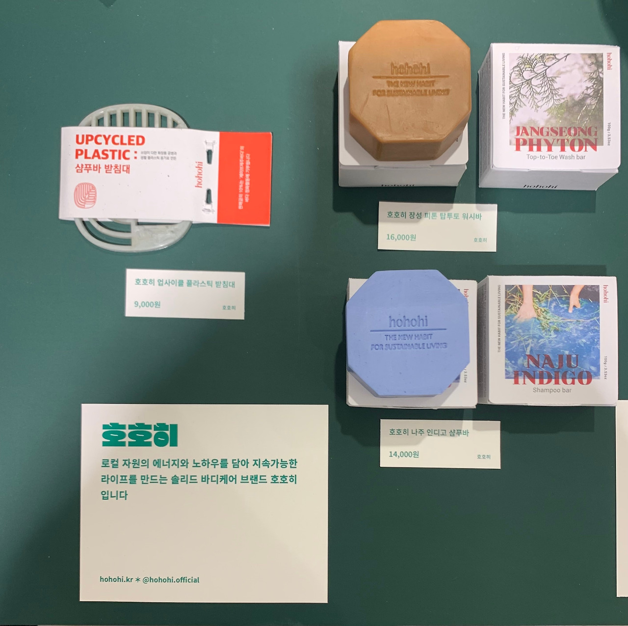 팝업스토어 중앙에는 플라스틱 프리 욕실과 주방을 만들어갈 수 있는 다양한 고체 제품들이 전시되어 있습니다. 호호히의 제품들도 전시되어 있으니 직접 보고 향도 맡아보시길 추천드립니다! 근처에만 가도 호호히 향기가 느껴질걸요?