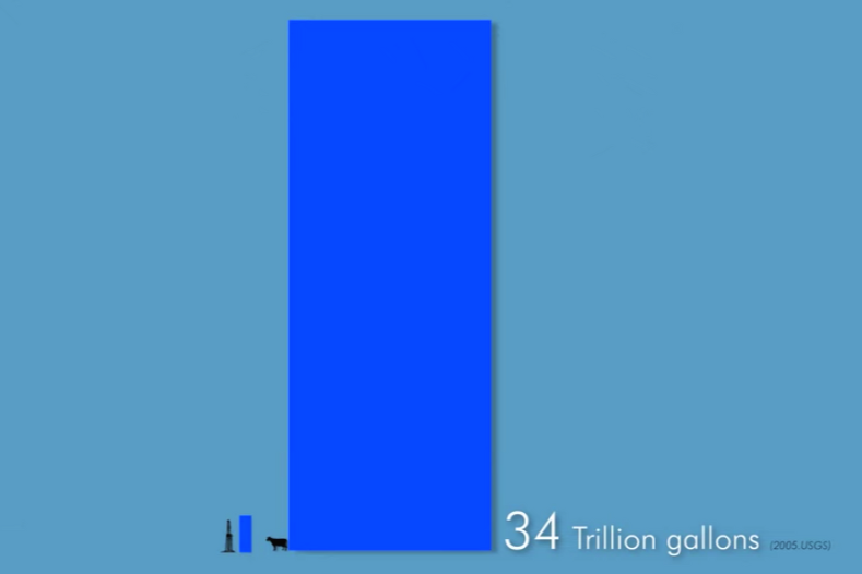 킵은 데이터와 통계 자료를 통해 축산업이 전 지구적 환경 파괴에 미치고 있는 실상을 낱낱이 나열해 보여줍니다. 미국 내 물 사용량 중 가정용수가 차지하는 비율은 5%에 그치는 반면 축산업은 55%를 차지합니다. 미국 내에 축산업에서만 가축을 기르는 데에 128조 리터의 물을 사용하죠. 지구 단위에서 물을 절약하려면 어느 쪽에서 선제적으로 변화해야 하는지 규모의 차이를 보여줍니다.