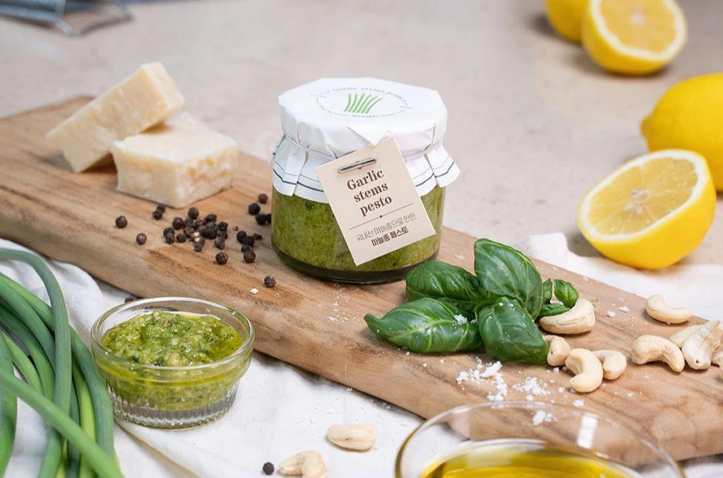 페스토의 원재료로 익숙한 시금치나 바질과 달리, 마늘쫑으로 맛을 내는 게 어려워 1년여 기간의 연구와 시행착오가 있었다고 하는데요. 모든 재료를 직접 로컬에서 구하고 합성 첨가물이나 착향료 등은 일체 사용하지 않는 방향으로 맛을 연구하고 개발했다고 합니다.