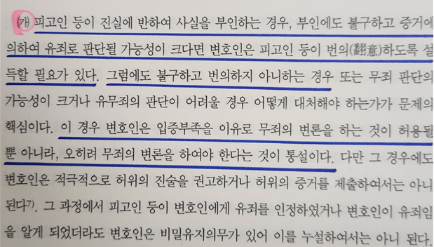 그 수업에서는 '피고인이 진실에 반해서 사실을 부인하는 경우, 그 부인에도 불구하고 증거에 의하여 유죄로 판단될 가능성이 큰 경우' 변호인의 의무에 대해서 이렇게 가르쳤다.