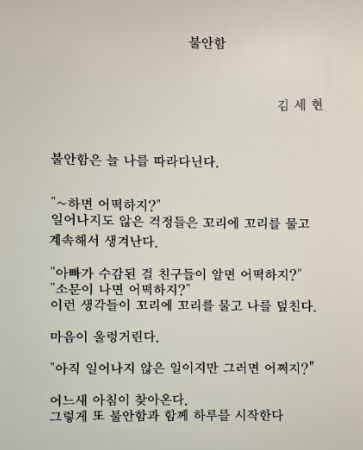 세움의 도움을 받아 어려운 시기를 잘 넘기고 반듯한 성인이 된 아이들은 위기 수용자 자녀들의 멘토로 활동하며 얼마 전 전시회를 열었다. 전시명은 '화양연화'이다.