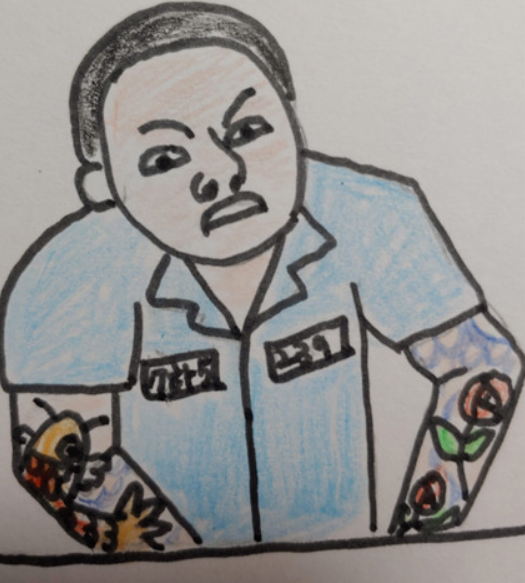 나도 모르게 자꾸만 피고인의 목과 가슴 쪽을 바라보게 되었다. 누가 그렸을까, 선을 되게 잘 땄다.. 색은 파란색일까 빨간색일까..