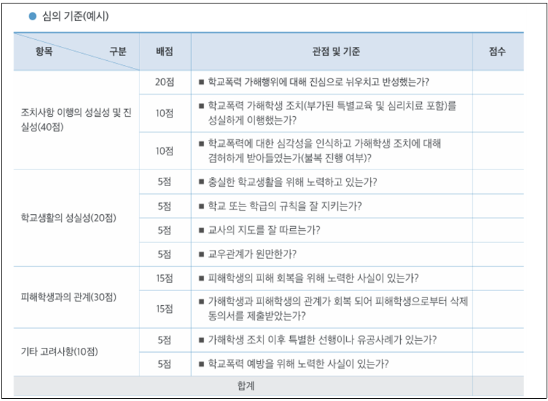 학교폭력심의위원회가 처분을 내리기 위해서는 일정한 심의기준에 점수를 매기는데, 위 심의 기준을 보면 대부분이 교사의 의견과 교사가 제출한 자료에 의존할 수 있는 내용들이다.