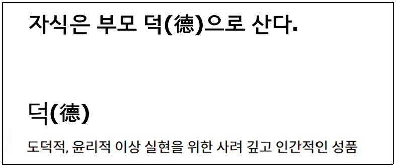 나는 그에게 '자식은 부모의 덕으로 산다.'는 말을 해주었다. 그는 맞장구를 치면서 나가서 열심히 돈 벌어 자식만큼은 잘 살게 할 거라고 했다. 나는 그에게 '부모의 덕'이란 재물 같은 것을 의미하는 것이 아니라 부모가 쌓은 덕을 의미한다고 말해주었다.