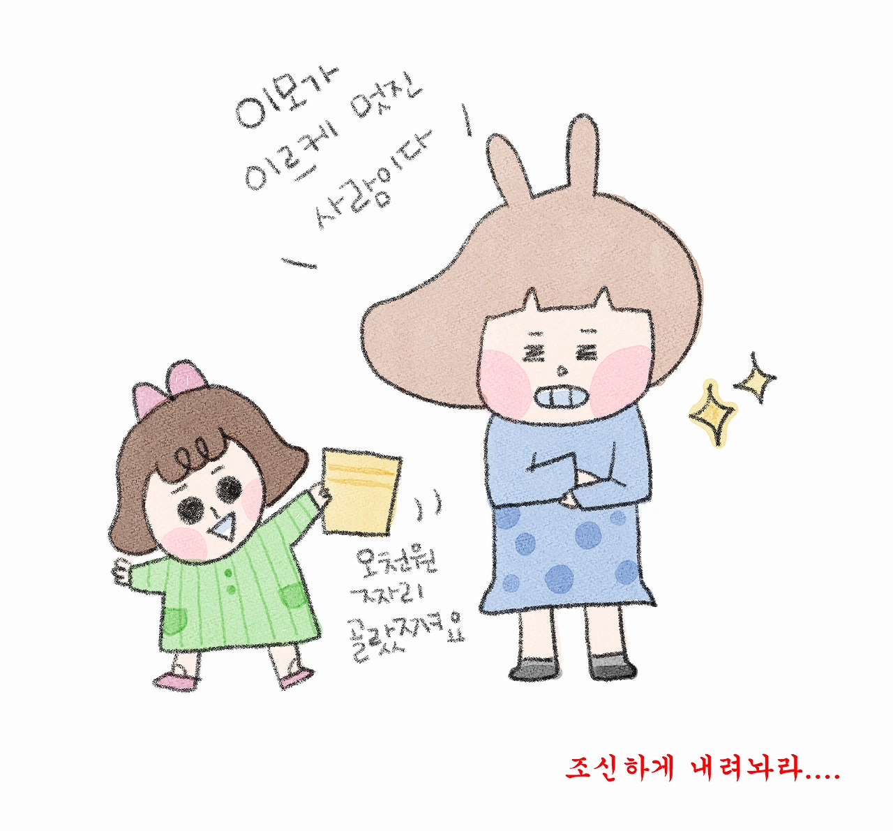 떡을 받아 든 아저씨의 손에 주름이 무성했다. 띄엄띄엄 난 흰머리를 보니 아빠 생각이 절로 났다. 아저씨는 “고맙습니다!” 하며 소리를 지르는 우리를 무뚝뚝한 표정으로 외면하며 얼른 돌아섰다. 몇 시간을 서성이다 겨우 벌게 된 오천 원. 셋이 깍지를 끼고 깡충거리고 있을 때 모퉁이를 돌던 아저씨가 다시 돌아왔다.