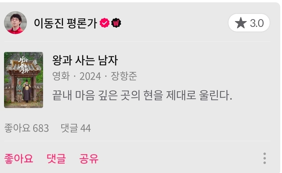 빨간 안경 이동진 평론가도 칭찬 많이 해 주고 격려 문자까지 보내곤 별 세 개 줬더라.