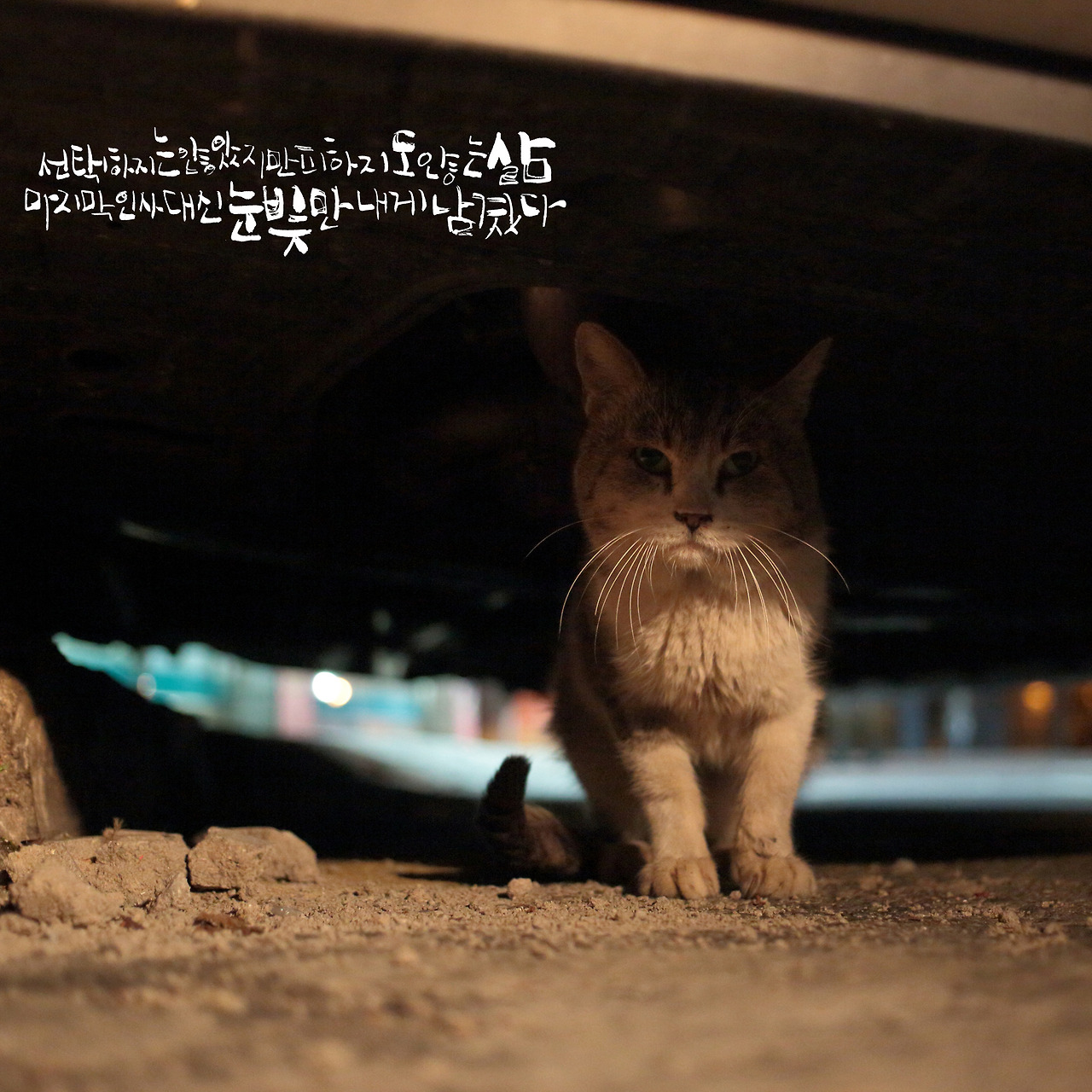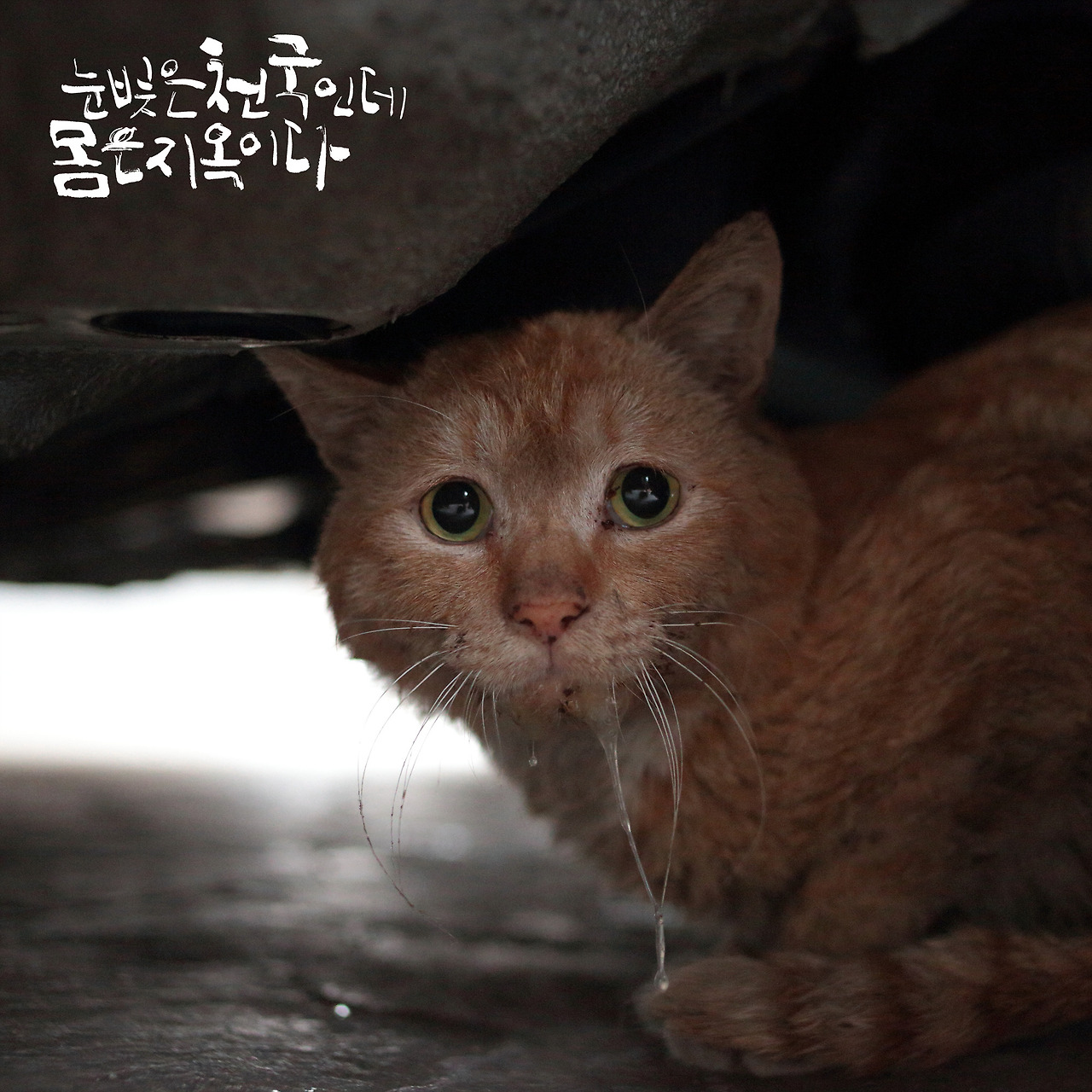 그는 무릎을 굽히고 고양이의 시선과 같은 눈높이로 세상을 바라본다. 그가 바라본 ‘사람들 무릎아래 세상’은 전쟁터고, 지옥이었다. “길고양이 사체수습이 1년에 8천 건이에요. 공식적으로 처리되는 게 그 정도고, 몇 배로 많은 길고양이들이 일상적으로 그렇게 죽어나가고 있는 거에요.” 로드킬당한 고양이들을 그의 손으로 땅에 묻은 일도 수차례. “로드킬당하면 보통은 바로 죽지만, 그렇지 않은 경우도 있어요. 도로 한가운데 쓰러져 바라본 기울어진 세상이 어땠을까 생각하면 미안하단 생각 말곤 아무것도 안 들어요.”