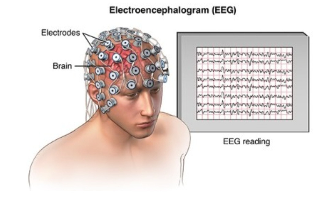 누가 머리에다가 심전도 전극을 붙인 것인가!실제 뇌파 검사는 좀 깨지만 수영모자 같은 걸 쓰고 한다.