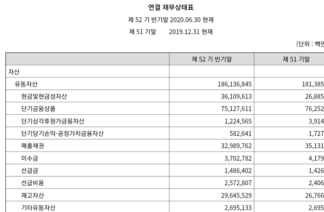 먼저 재무제표에 대한 이야기를 해야겠다. 재무제표는 기본적으로 숫자를 우측 정렬 표기한다. Dart(금감원 전자공시사이트)에 가서 아무 보고서나 열어 보면, 다음과 같은 재무제표를 구경할 수 있다.