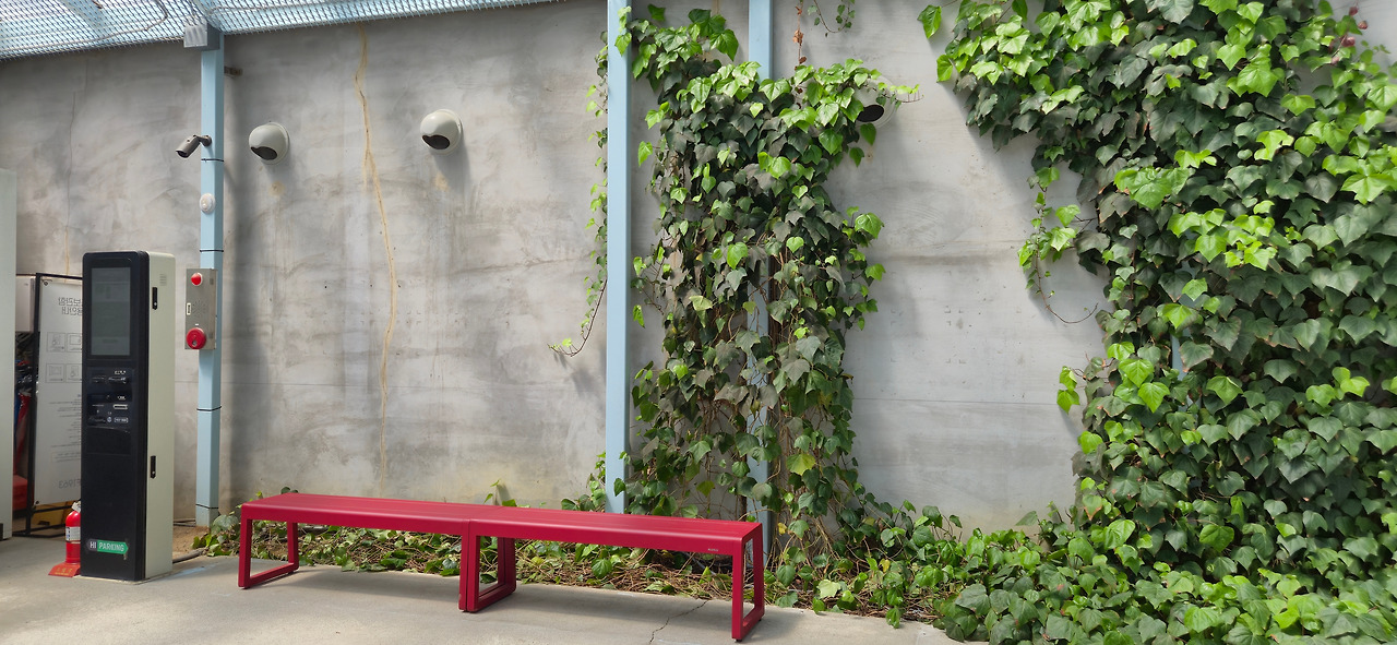 다른 건물로 이어지는 통로에는 붉은 벤치가 놓여 있었다.